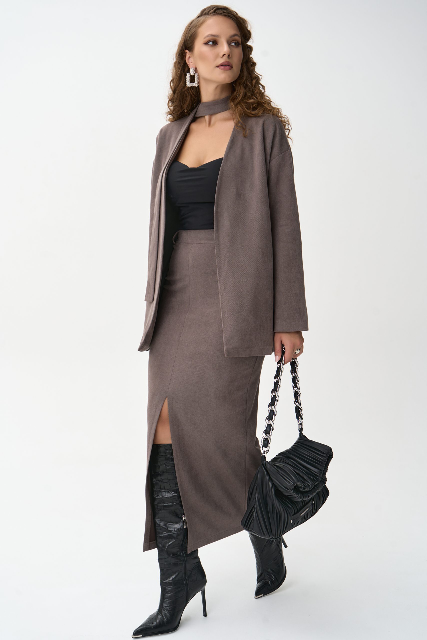 Чтобы подобрать идеальную посадку, мы разделили костюм на два отдельных товара: жакет и юбка продаются отдельно — вы можете выбрать нужный размер для каждой части.
