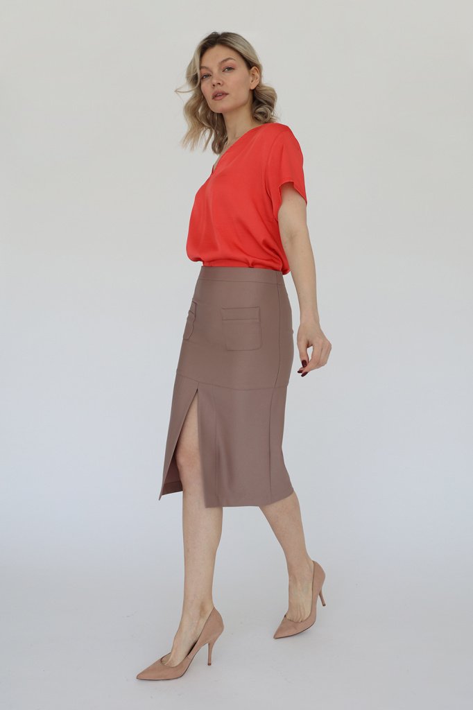 Юбка-карандаш из костюмной ткани. С накладными карманами и разрезом по переду. Застежка на потайную молнию в среднем шве спинки.