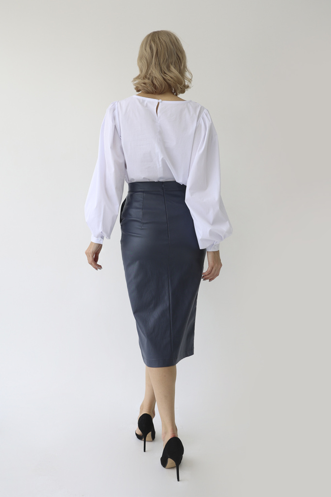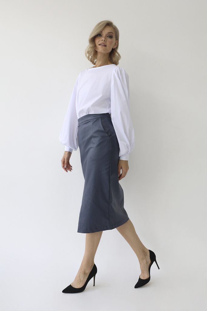 Юбка из костюмной ткани с напылением под кожу. Притачной пояс, разрез по переду, Карманы. Потайная молния в среднем шве спинки.