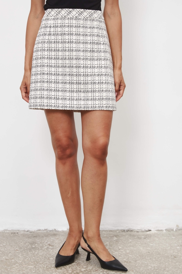 Лаконичная юбка длины мини из твида. Застёжка на потайную молнию сбоку. Изделие на подкладке из поливискозы.