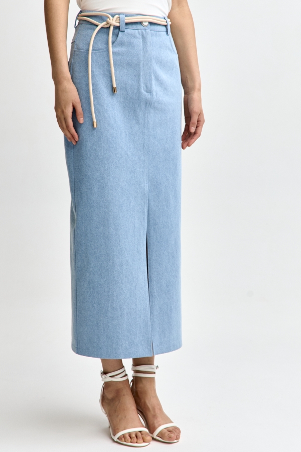 Юбка длины мидакси из джинсового полотна. Модель прямого силуэта на притачном поясе. По переду высокий разрез, боковые карманы. По спинке кокетка с накладными карманами. Застёжка-гульфик.