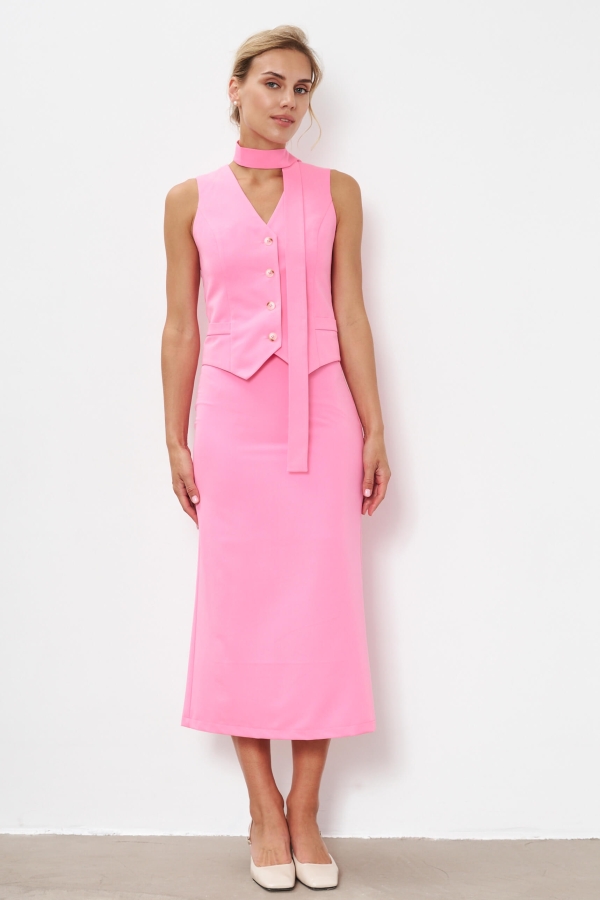 Лаконичная юбка из костюмного полотна на подкладке из поливискозы. Модель прилегающего силуэта, к низу слегка расширена. Разрез по спинке. Шлевки по поясу и карманы по переду. Застежка на молнию.