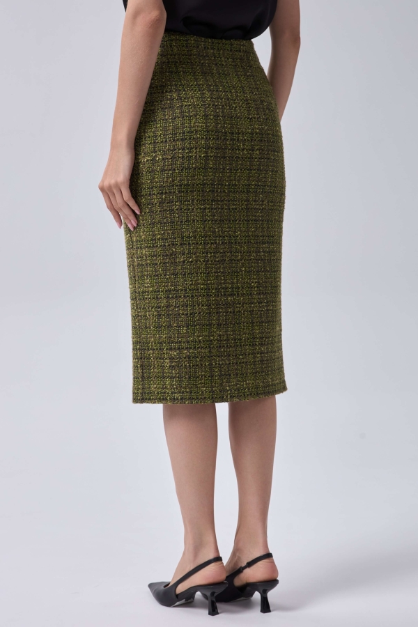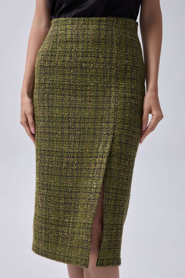 Юбка из твида с фигурным разрезом. Модель прямого силуэта на поливискозном подкладе. Средняя посадка. По переду разрез. Застежка - потайная молния. По спинке шлица. Изделие на подкладе.