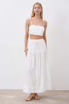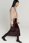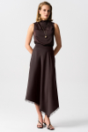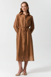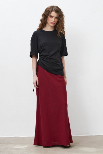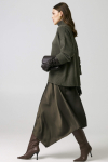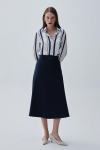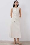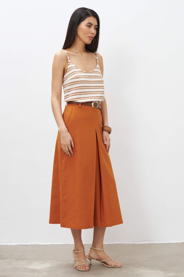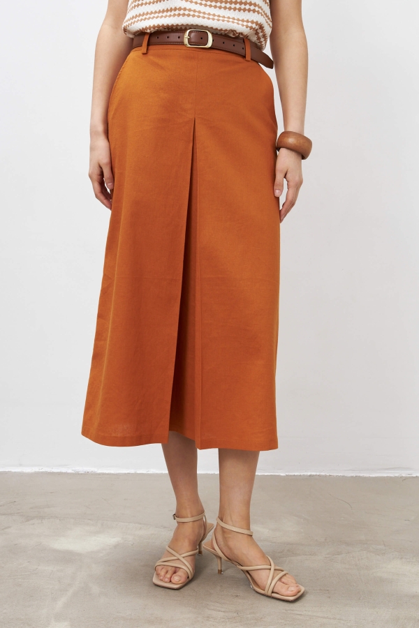 Юбка длины миди из льняного полотна. Модель А-силуэта со встречной складкой. Боковые карманы, по линии талии шлевки. Застежка по спинке на потайную молнию.