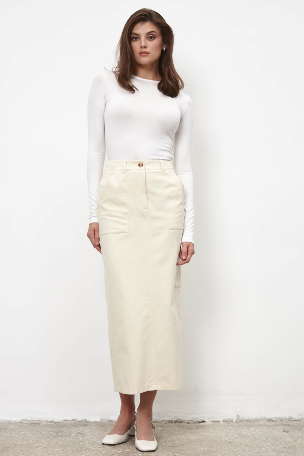 Юбка длины миди из денима в сливочном оттенке. Модель прямого силуэта. Притачной пояс со шлевками. По переду и спинке накладные карманы. По спинке кокетка и разрез.