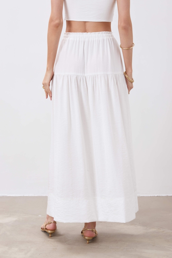 Трендовая юбка из фактурной вискозы. Модель свободного силуэта с резинкой и кулиской. Изделие из двух ярусов. Низ изделия оформлен широкой, декоративной подгибкой.