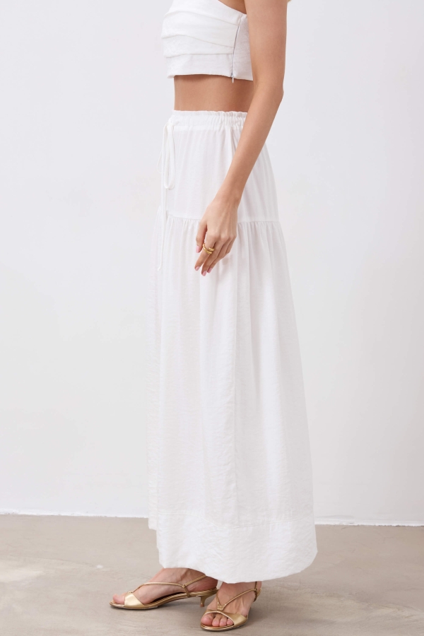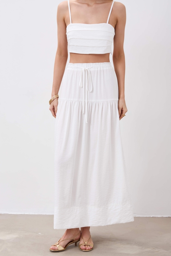 Трендовая юбка из фактурной вискозы. Модель свободного силуэта с резинкой и кулиской. Изделие из двух ярусов. Низ изделия оформлен широкой, декоративной подгибкой.
