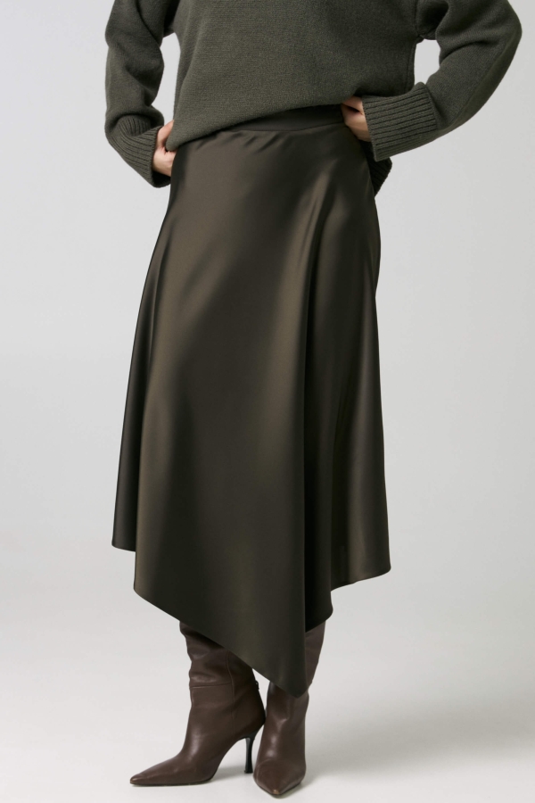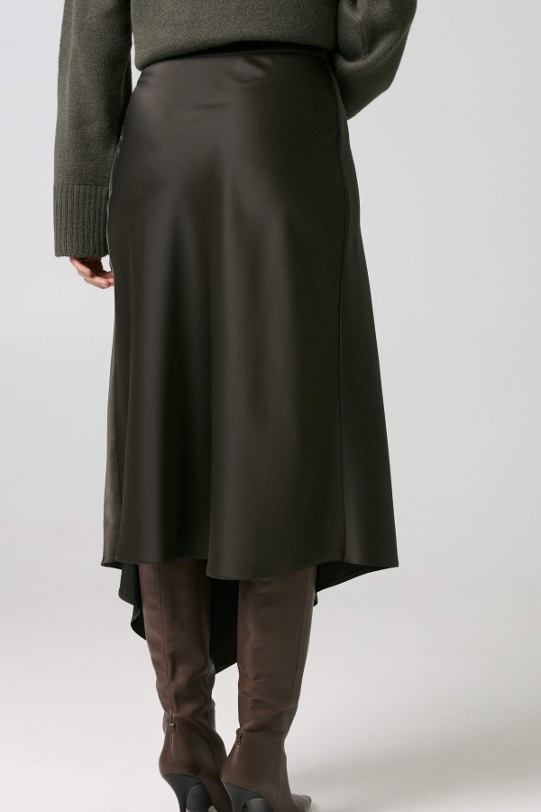Юбка ассиметричного кроя из фактурного атласа. Модель трапециевидного силуэта, выкроена по косой. Ассиметричная линия низа. Пояс, застежка на потайную в боковом шве.