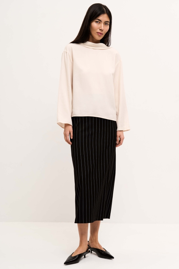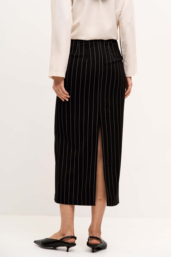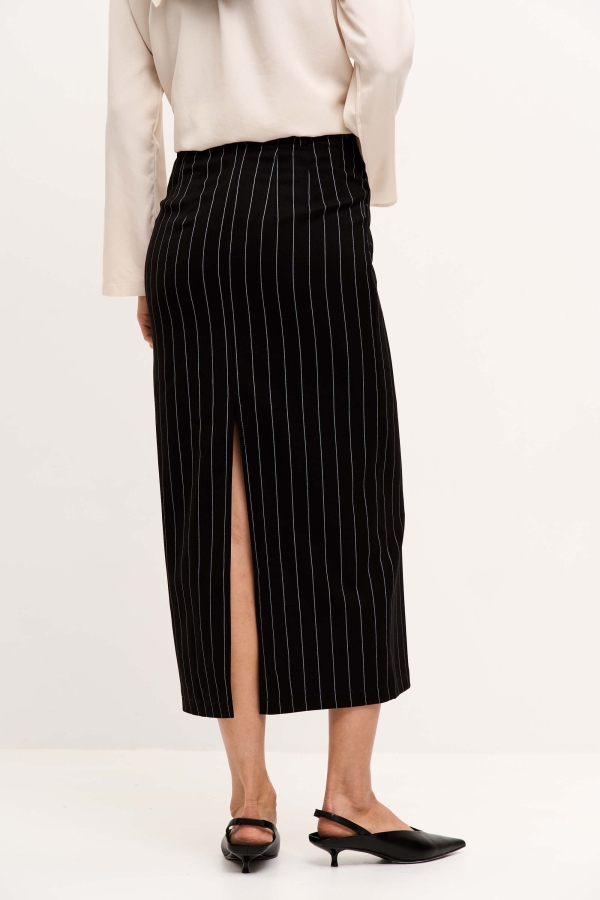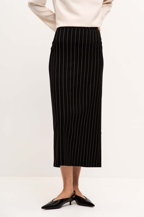 Юбка длины миди в полоску. Модель прямого силуэта на притачном поясе. По спинке разрез, застежка на потайную молнию. Изделие на подкладке из поливискозы.
