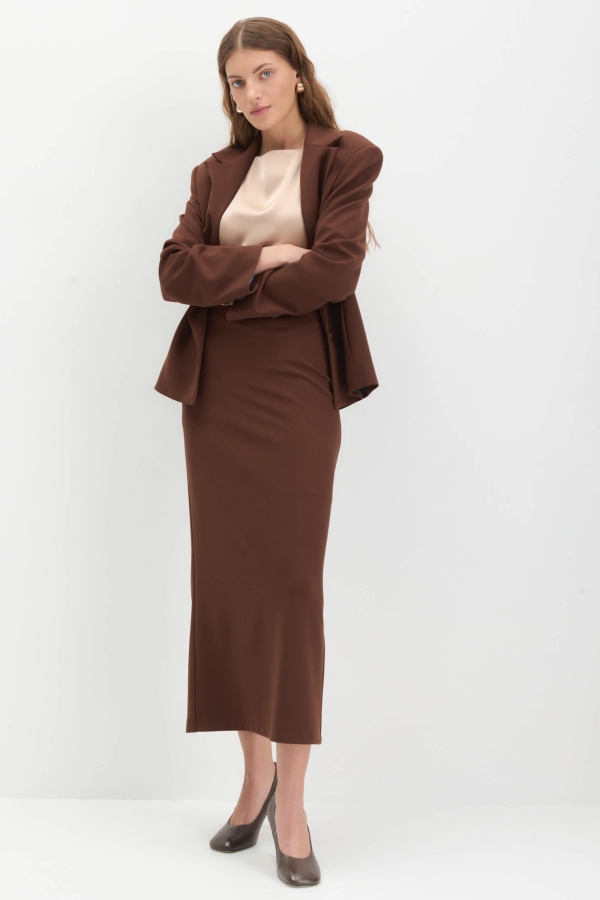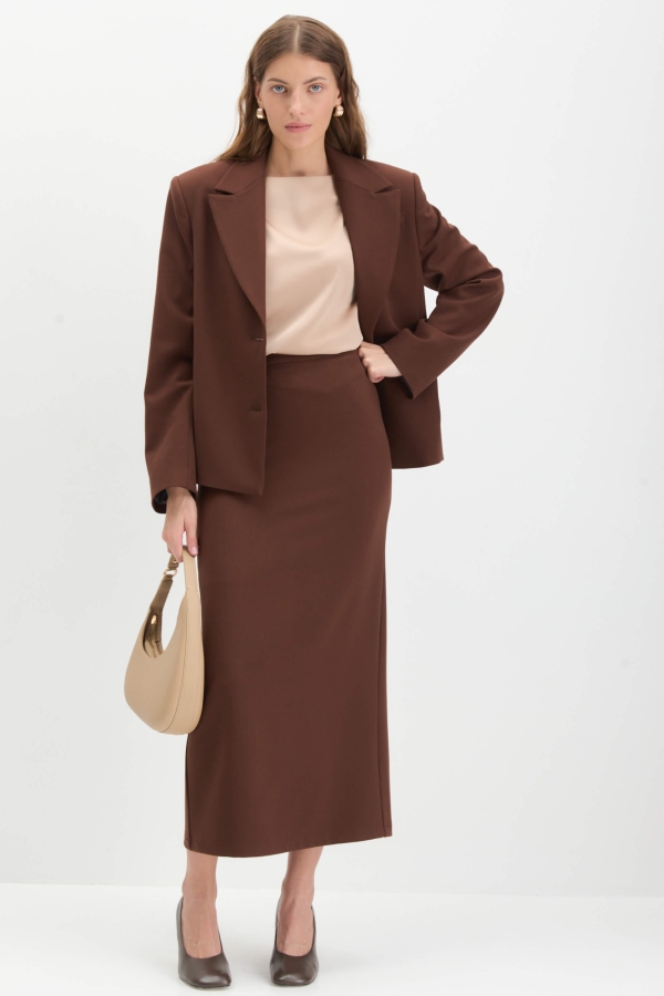Юбка длины миди шоколадного оттенка. Модель прямого силуэта на притачном поясе. По спинке разрез, застежка на потайную молнию. Изделие на подкладке из поливискозы.