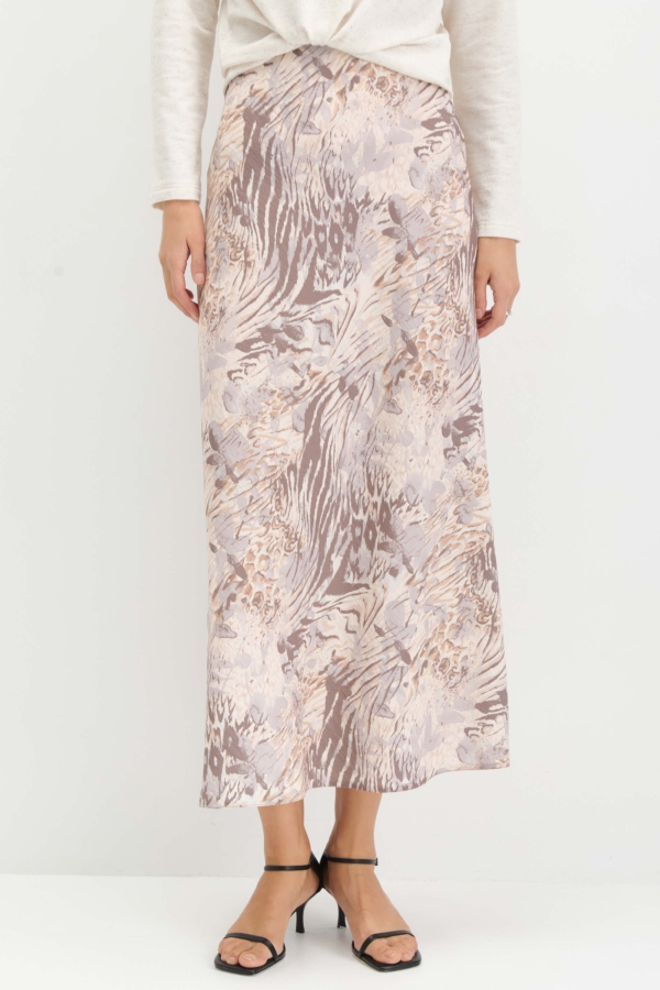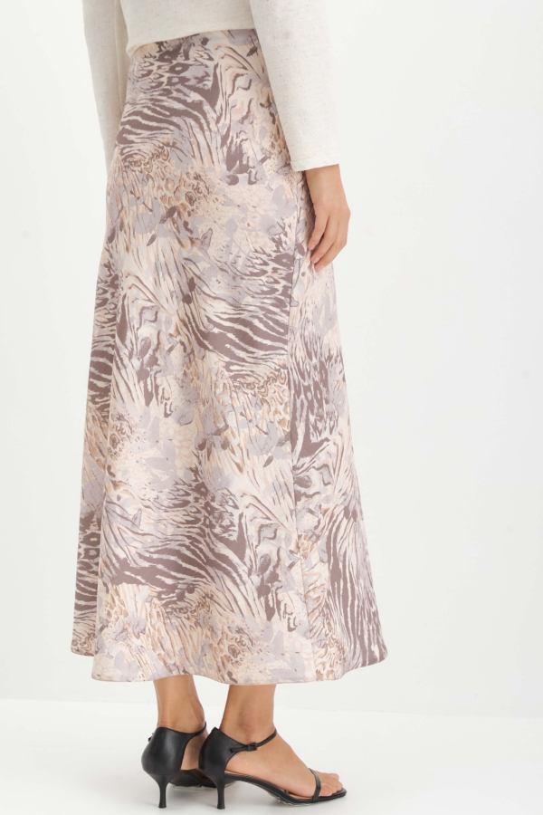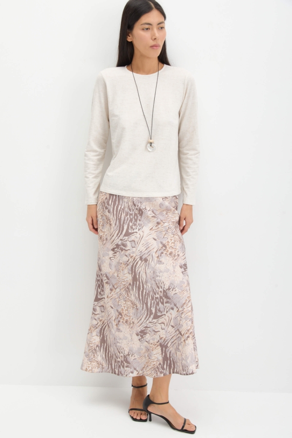 Юбка длины миди с принтом из фактурной вискозы. Модель полуприлегающего силуэта, скроенная по косой для идеальной посадки. Изделие на обтачке с внутренней мягкой резиной.