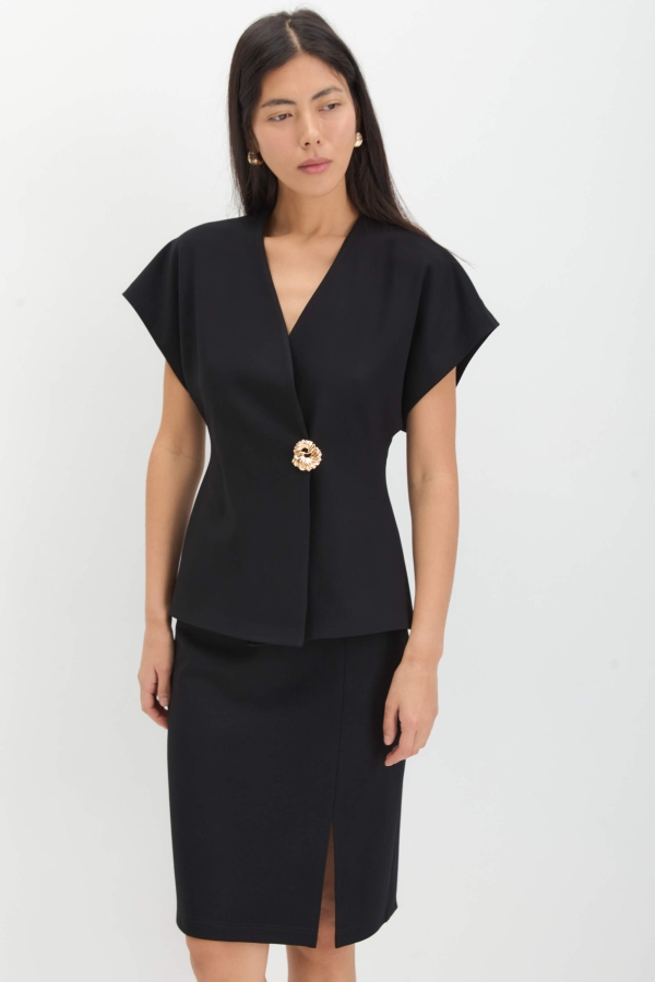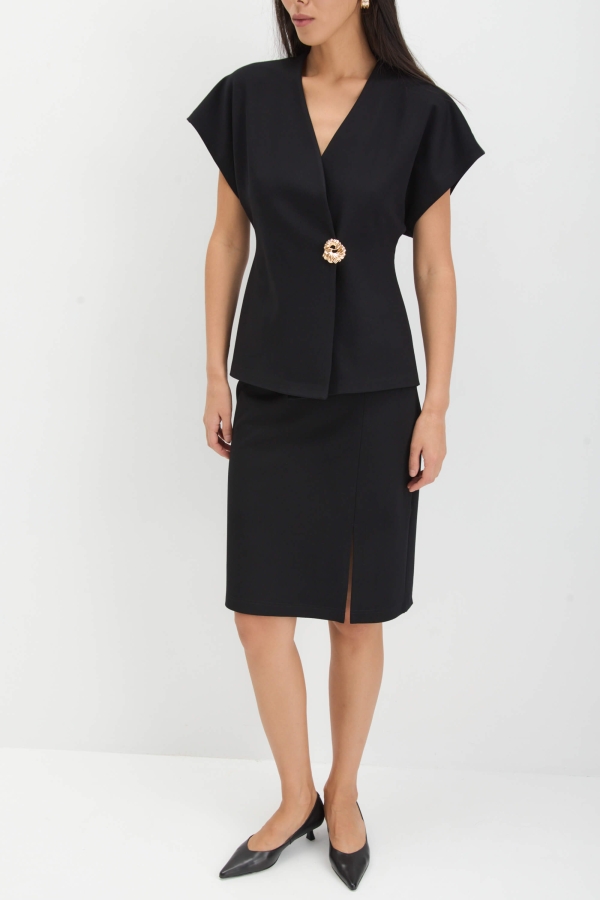 Юбка из плотного трикотажа с деликатным разрезом. Модель полуприлегающего силуэта на обтачке. По переду разрез. Застежка сбоку на потайную молнию.