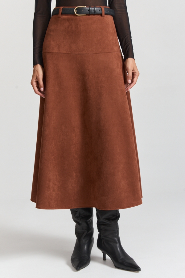 Женственная юбка из эко замши в ретро стиле. Юбка А-силуэта с притачным поясом и отрезной кокеткой + шлевки, застежка на потайную молнию в боковом шве.