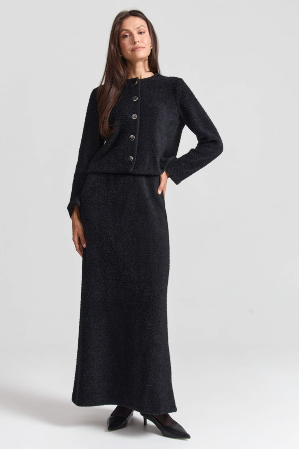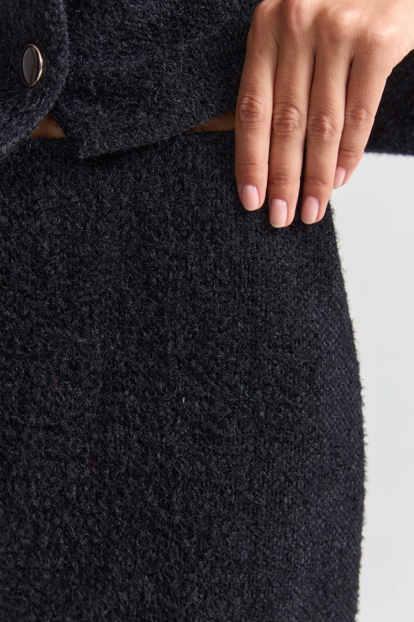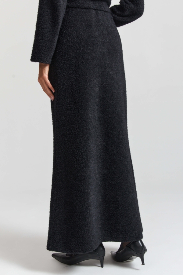 Трендовая юбка из фактурного трикотажа в черном цвете. Юбка легкого А-силуэта на обтачке и внутренней широкой резине.
