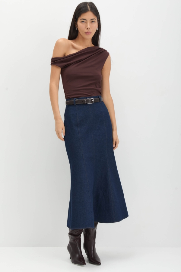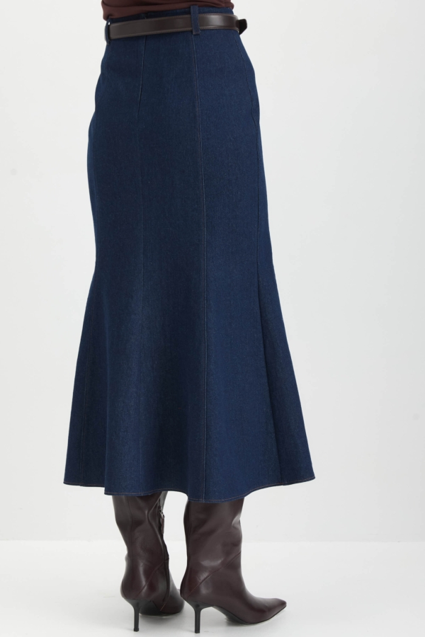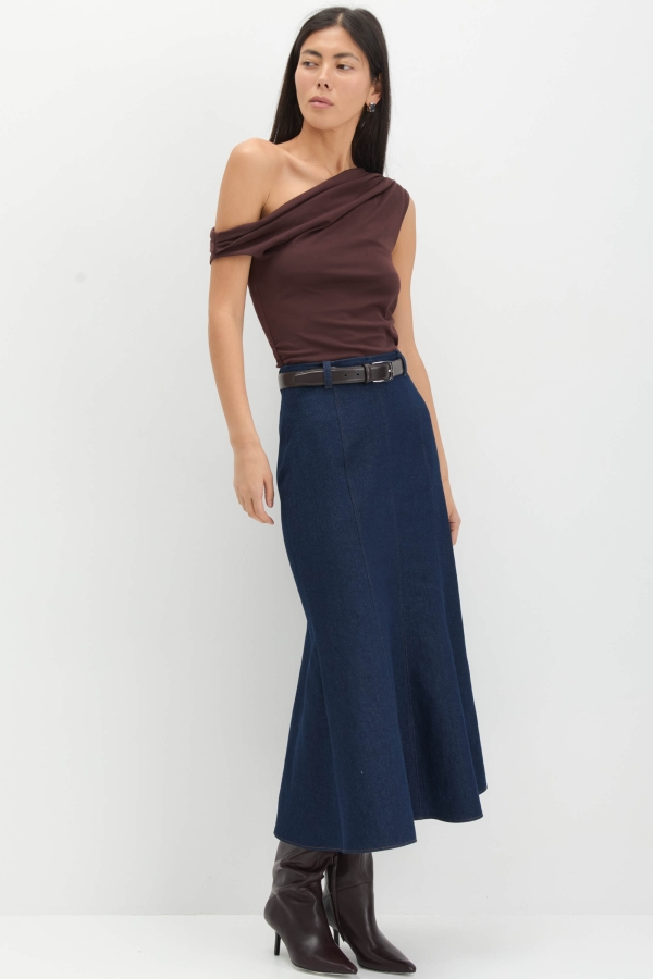Силуэтная юбка из денима в темно-синем оттенке. Модель прилегающего силуэта с рельефами, формирующими красивый силуэт. Изделие на обтачке, застежка на потайную молнию по спинке. На талии шлевки для возможной стилизации с ремнем.