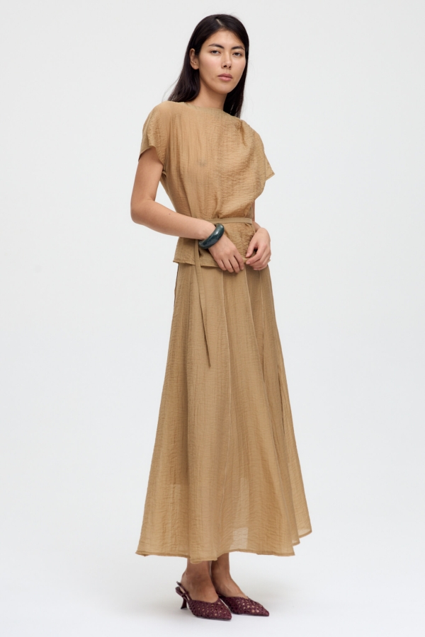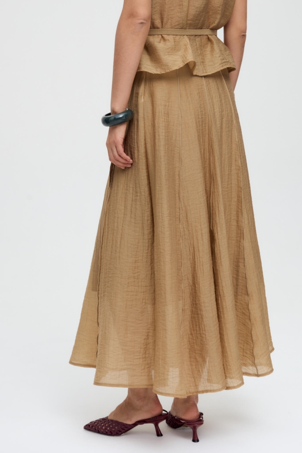 Юбка длины миди из жатой вискозы. Модель А-силуэта на притачном поясе. Застежка в боковом шве на потайную молнию. Клинья с декоративными наружными швами создают утонченный силуэт. Изделие на подкладке.