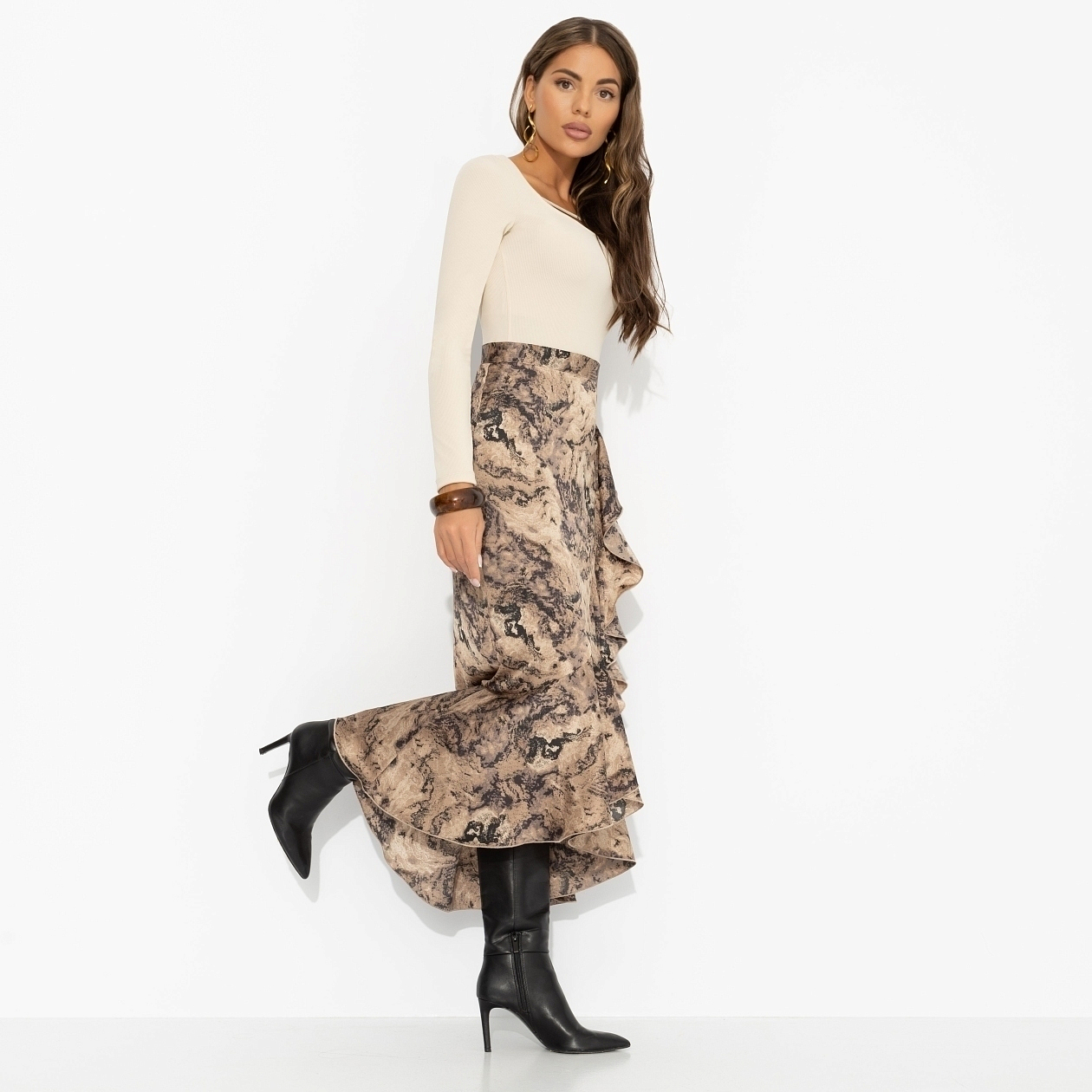 Юбка с воланами от ЧАРУТТИ как крылья для нового старта. В ней обычный понедельник превратится в день, когда рутина наконец отпускает. В юбке можно быть веселой, громкой и любой другой. Вам простят все. Можно даже кружиться, стоя на светофоре. Потому что иногда новая жизнь не начинается, она танцуется. Юбка облегающего силуэта в трендовой длине миди. Обрамлена объемными воздушными воланами по передней стороне. Посадка высокая на талии. Застегивается на скрытую молнию сбоку.