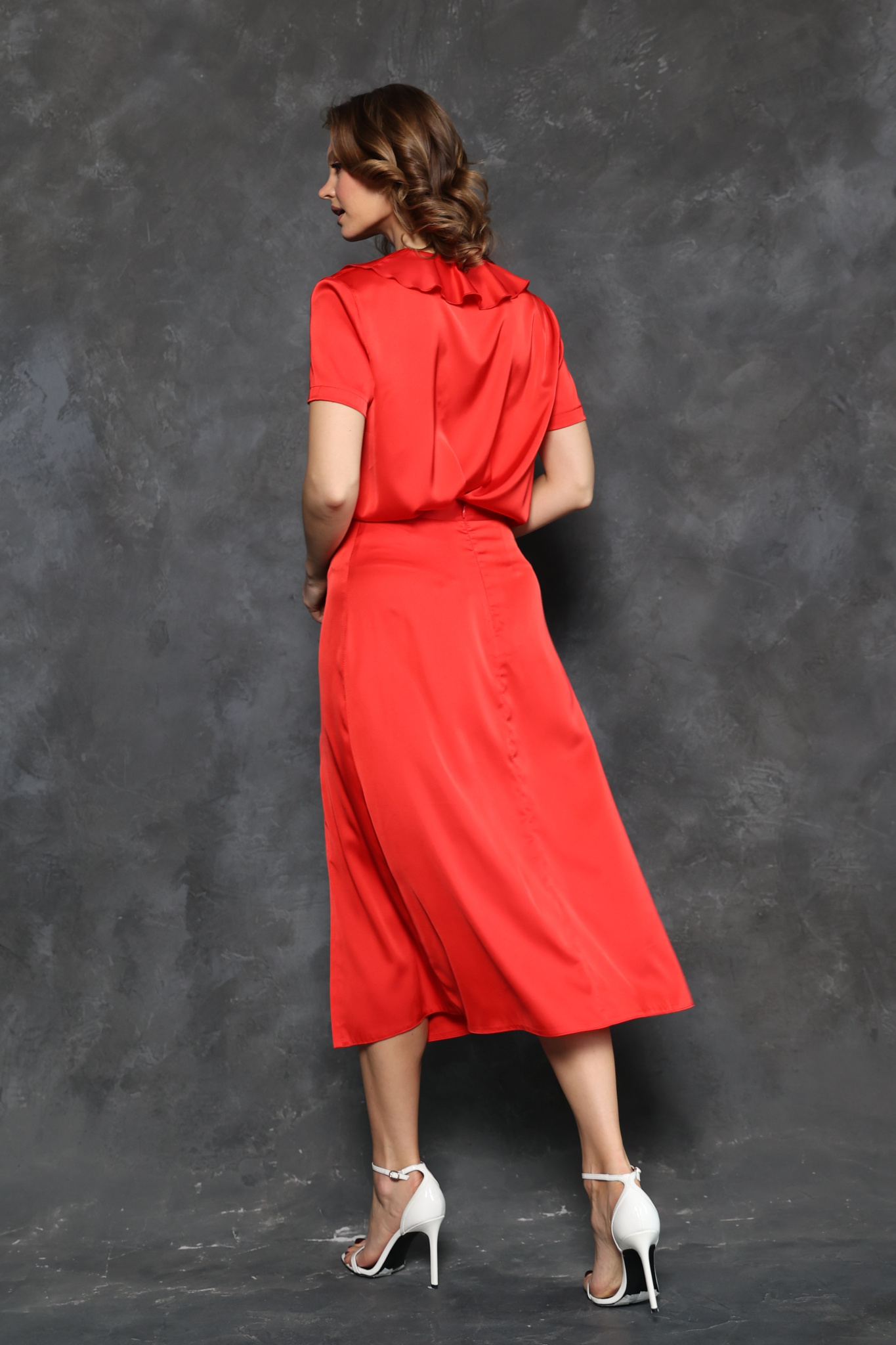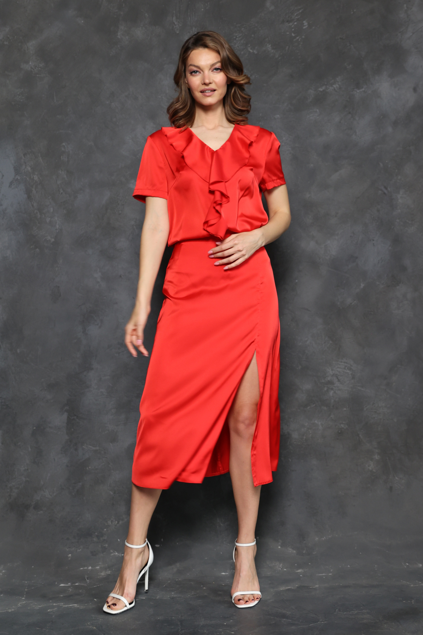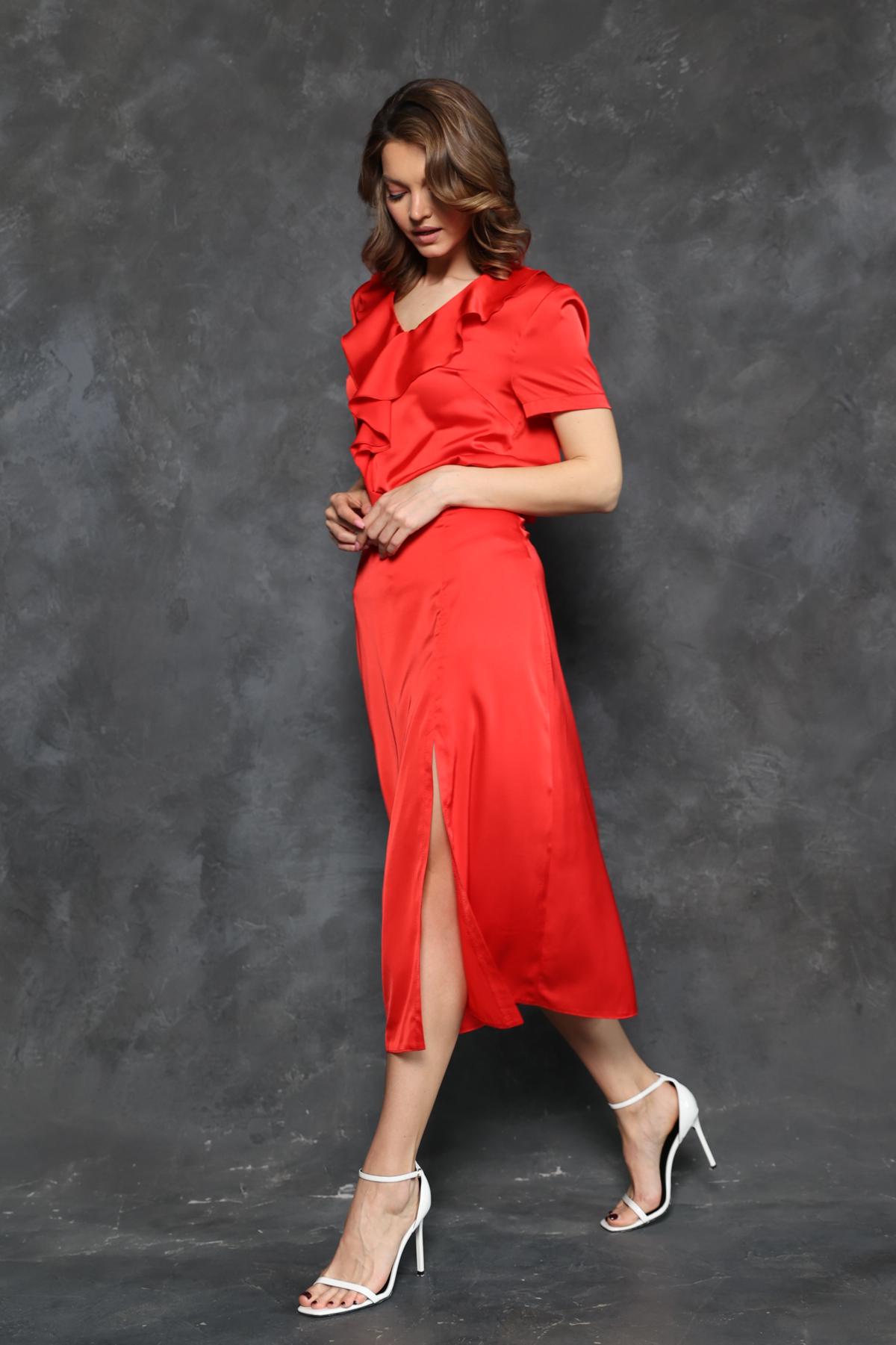 Юбка трапеция с притачным поясом. Потайная молния в среднем шве спинки. Смещённый разрез по переду. Изделие выполнено без подкладки.