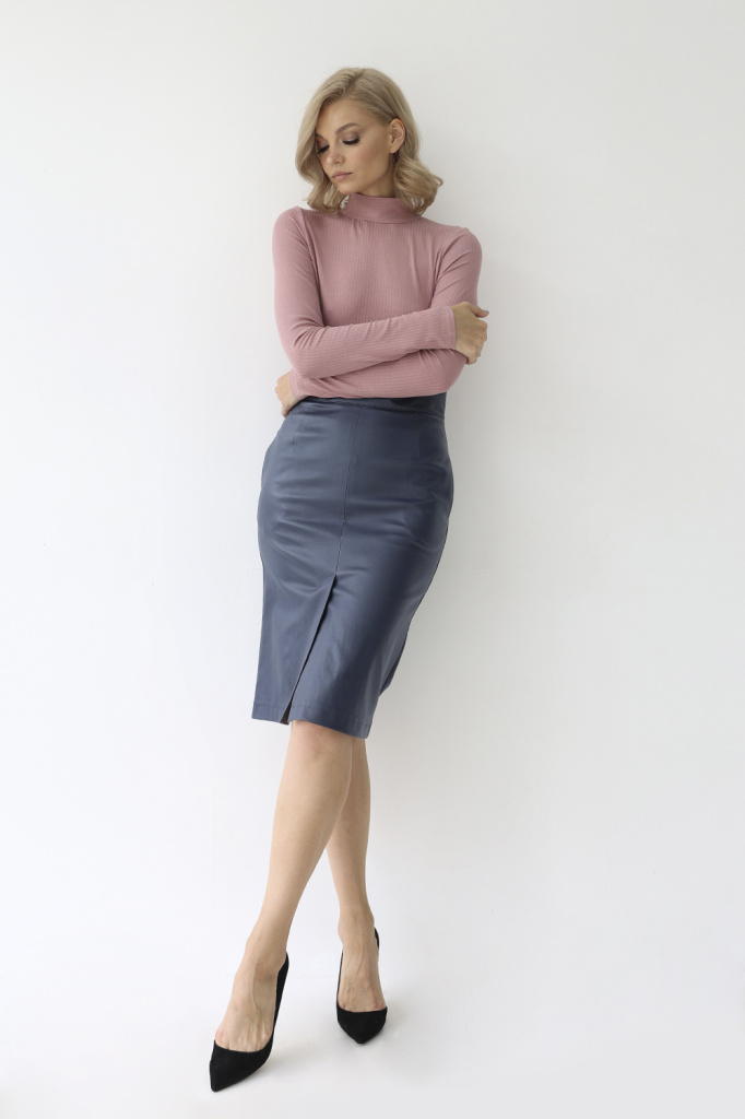 Прямая юбка на широком притачном поясе. Со шлицей по переду. Юбка выполнена из костюмной ткани с напылением под кожу. Потайная молния в среднем шве спинки.