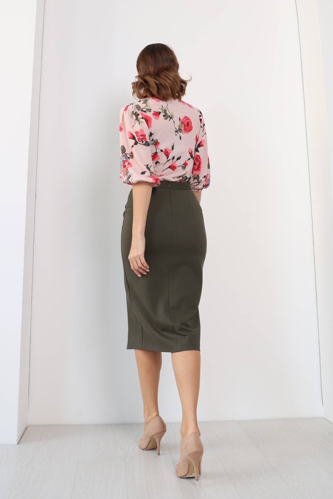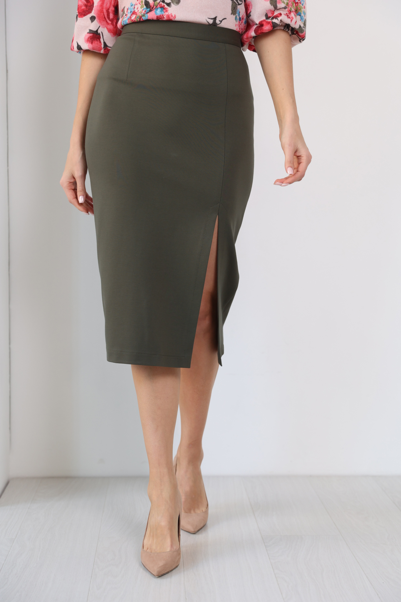 Юбка карандаш со смещённым разрезом по переду. Притачной пояс. Застёжка на потайную молнию в среднем шве спинки. Изделие выполнено без подкладки.