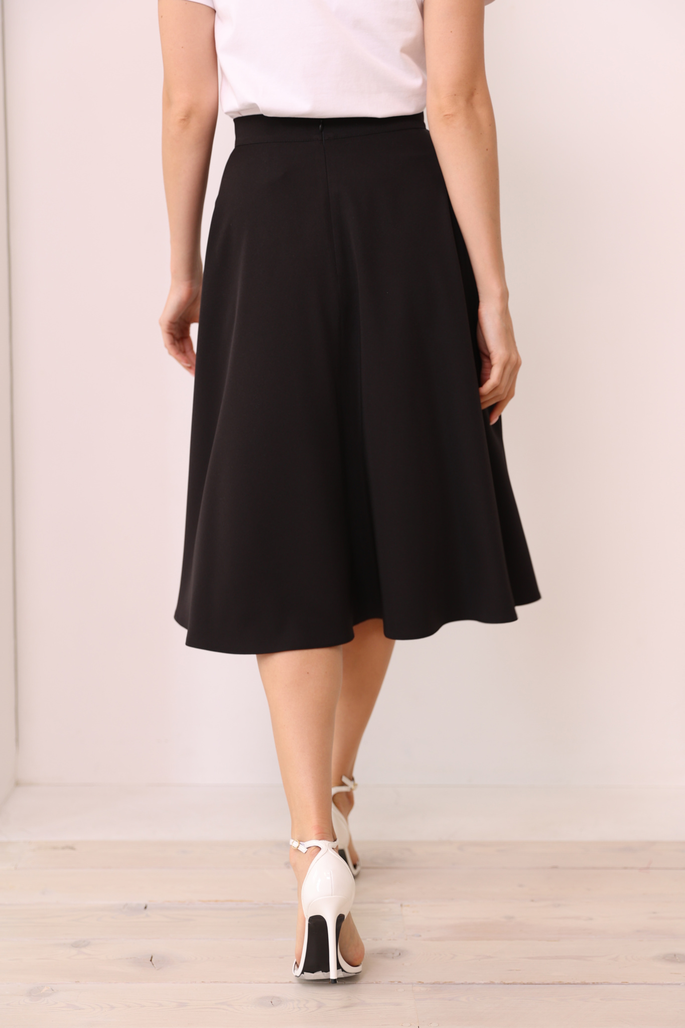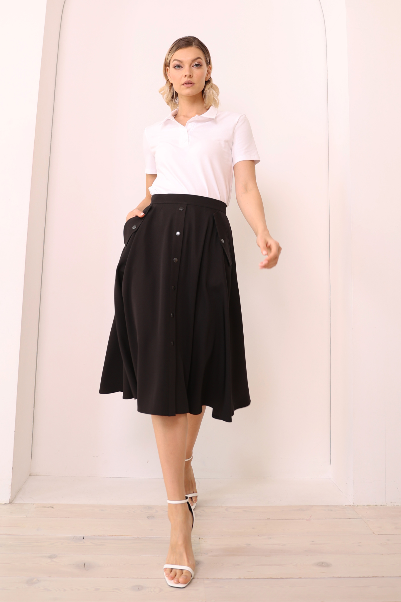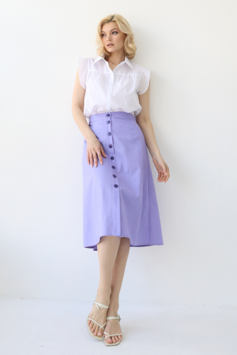 Юбка- трапеция на пуговицах. Выполнена из костюмной ткани. Карманы с клапанами и фурнитурой в боковых швах изделия.