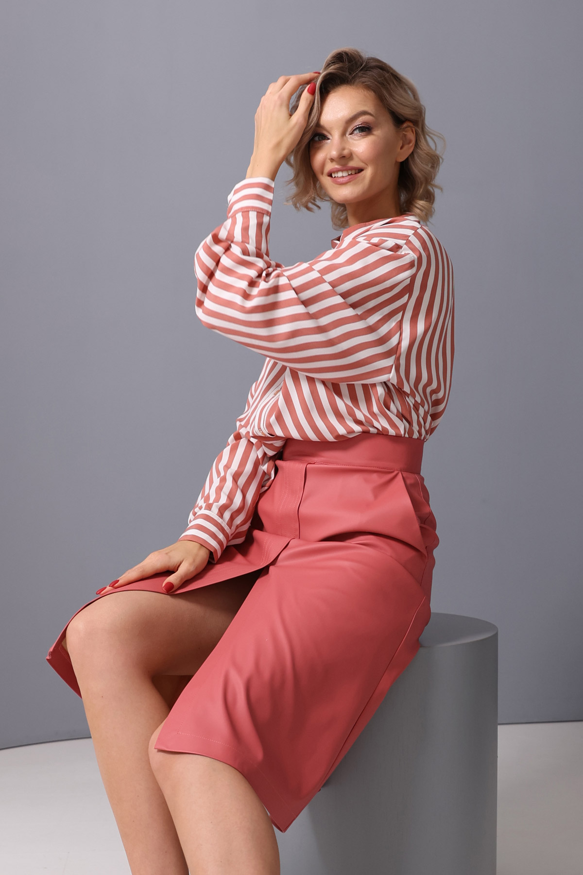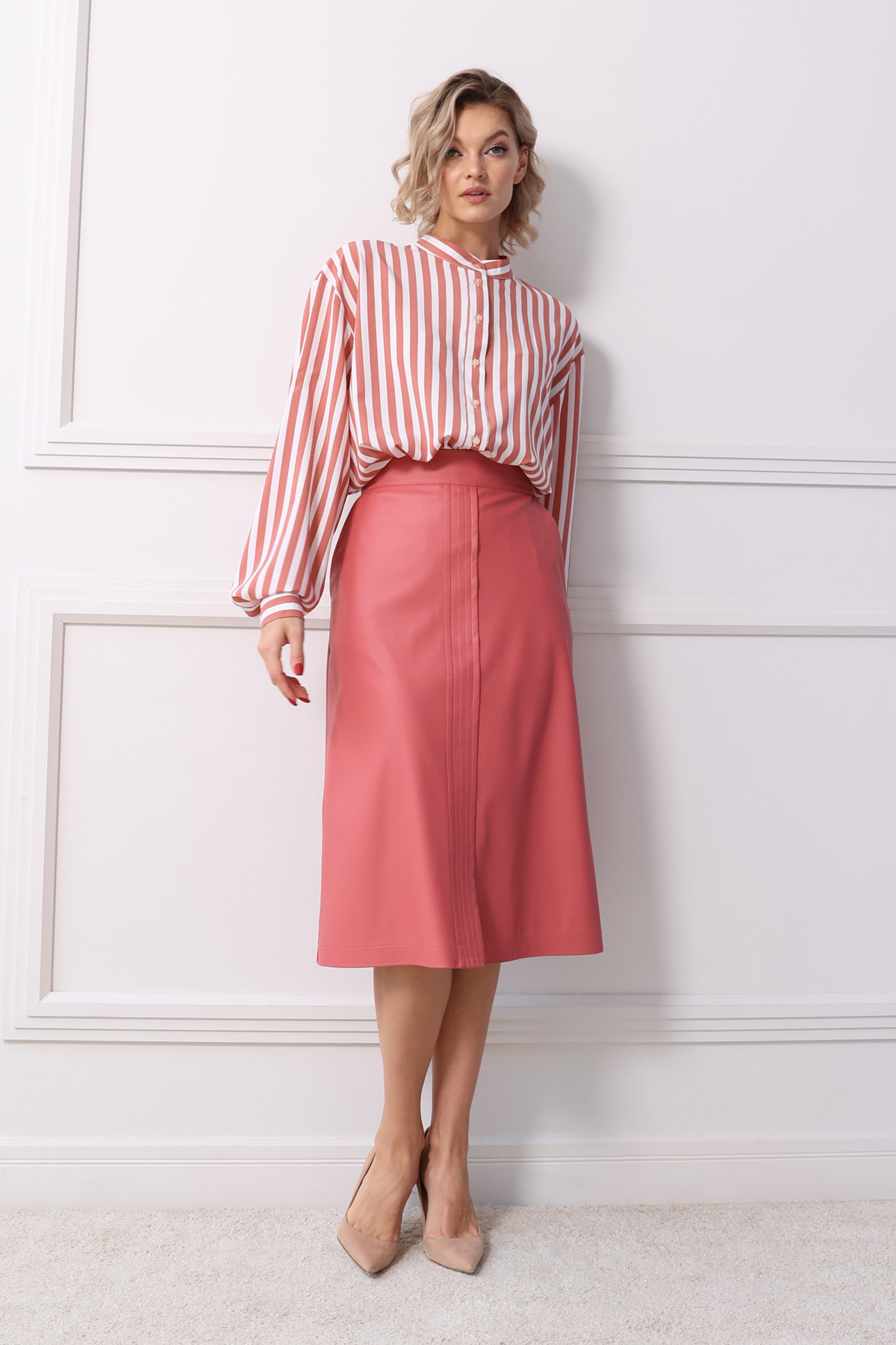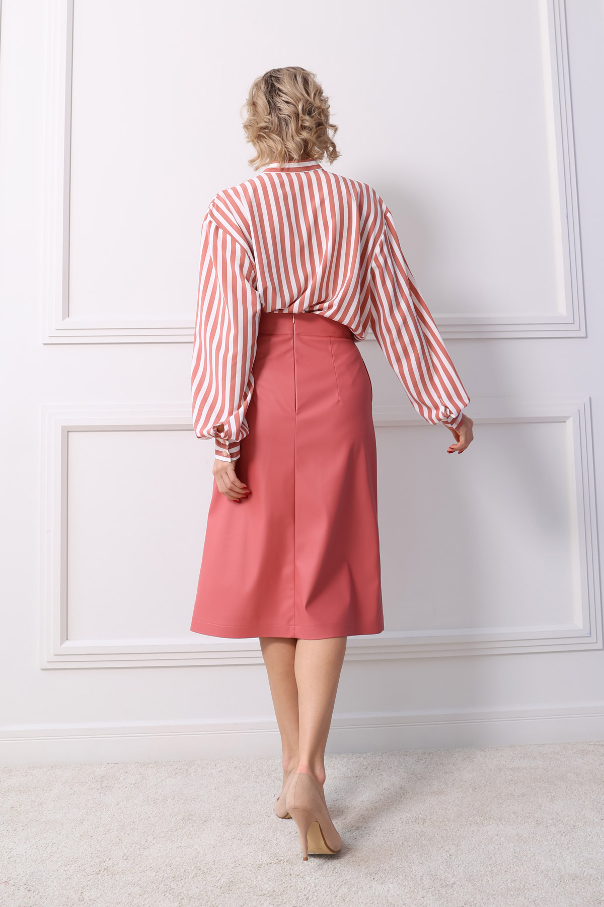 Юбка-трапеция из экокожи. Притачной пояс, потайная молния в средне шве спинки, карманы в боковых швах. Декоративный нахлёст с застрочкой и разрезом по переду.
