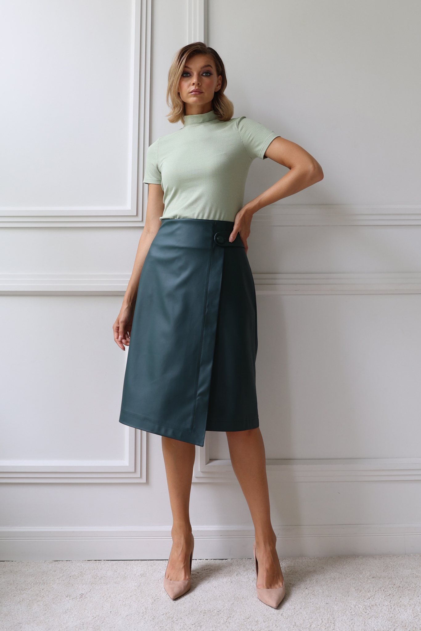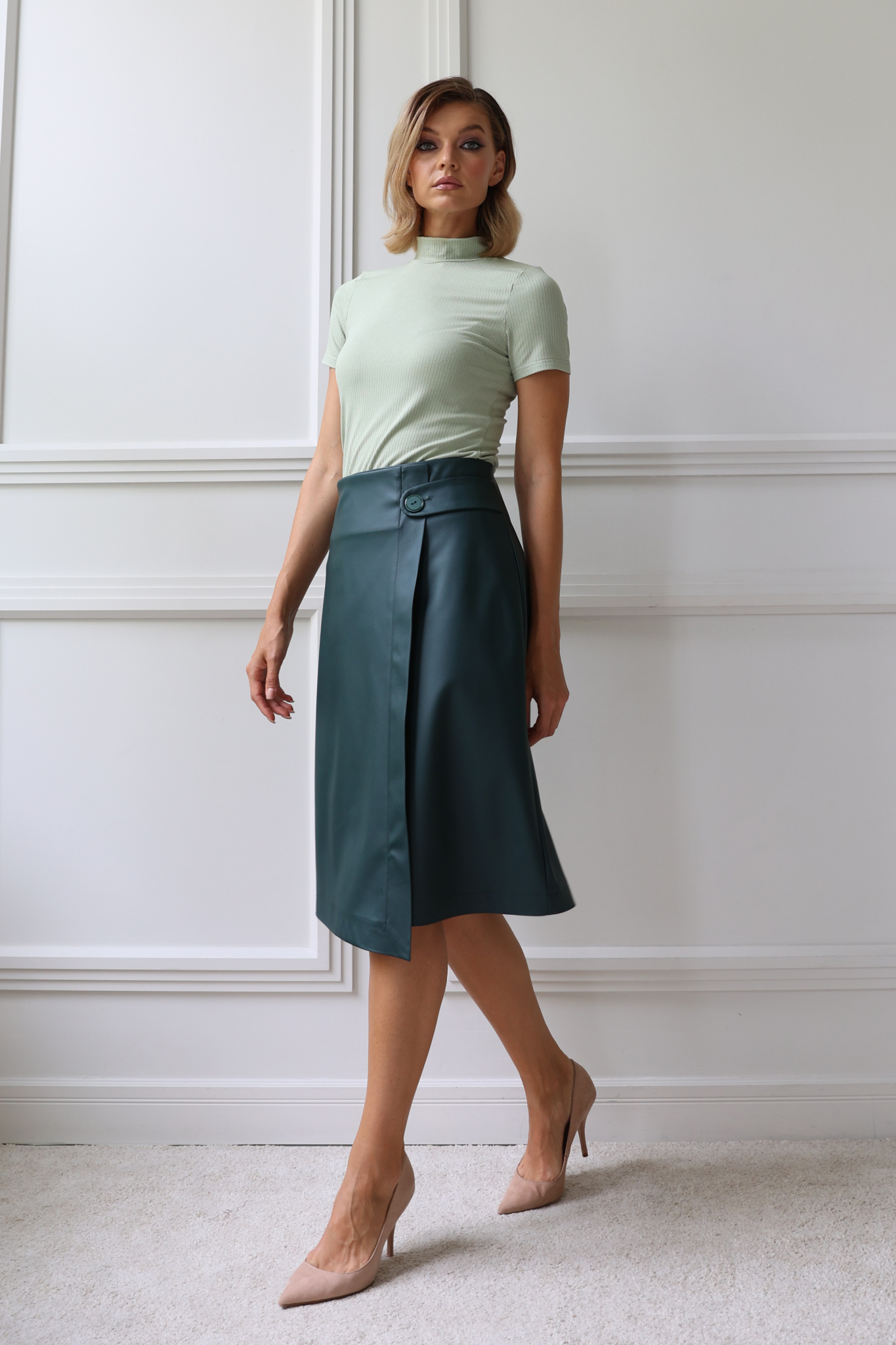 Юбка с асимметричным запАхом. Застёжка на потайную пуговицу и боковой хлястик. Изделие выполнено без подкладки.