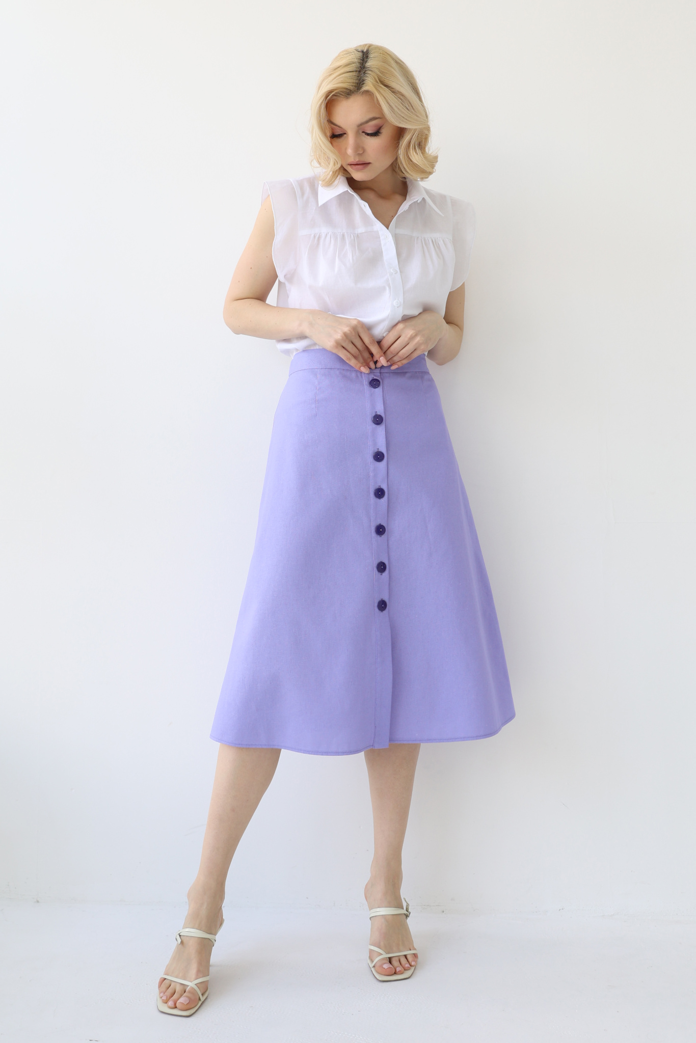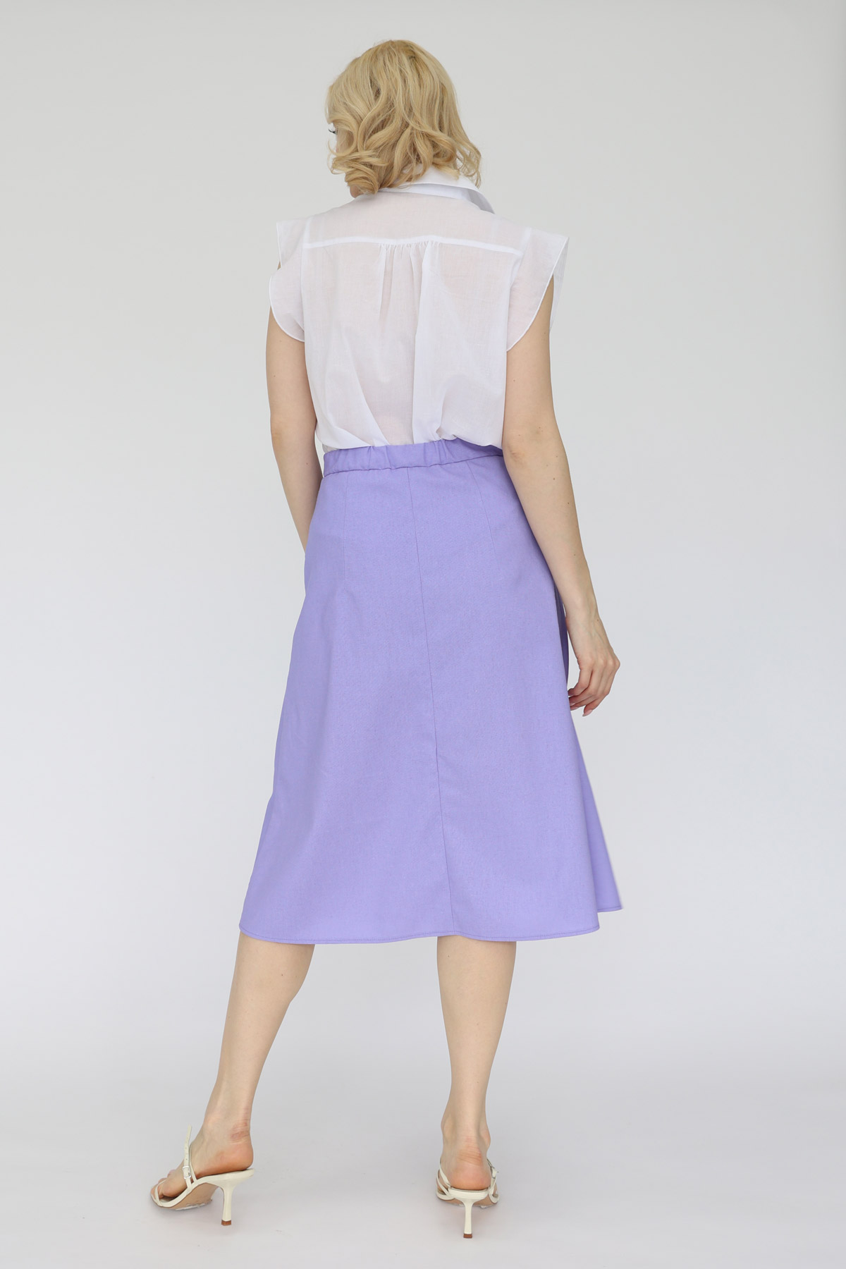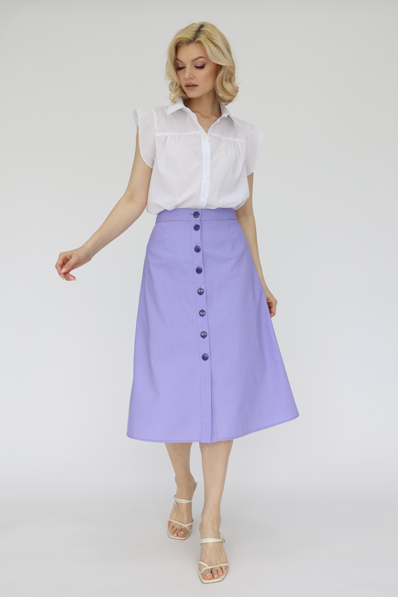 Юбка из смесового льна с застежкой на пуговицы по переду. Притачной пояс, резинка со стороны спинки.