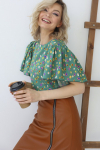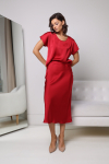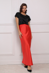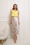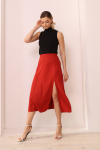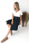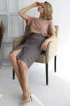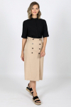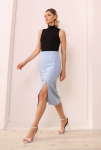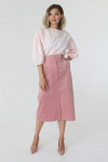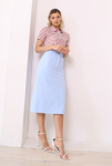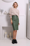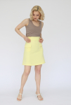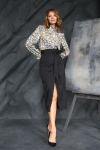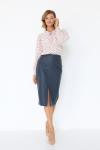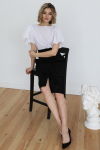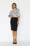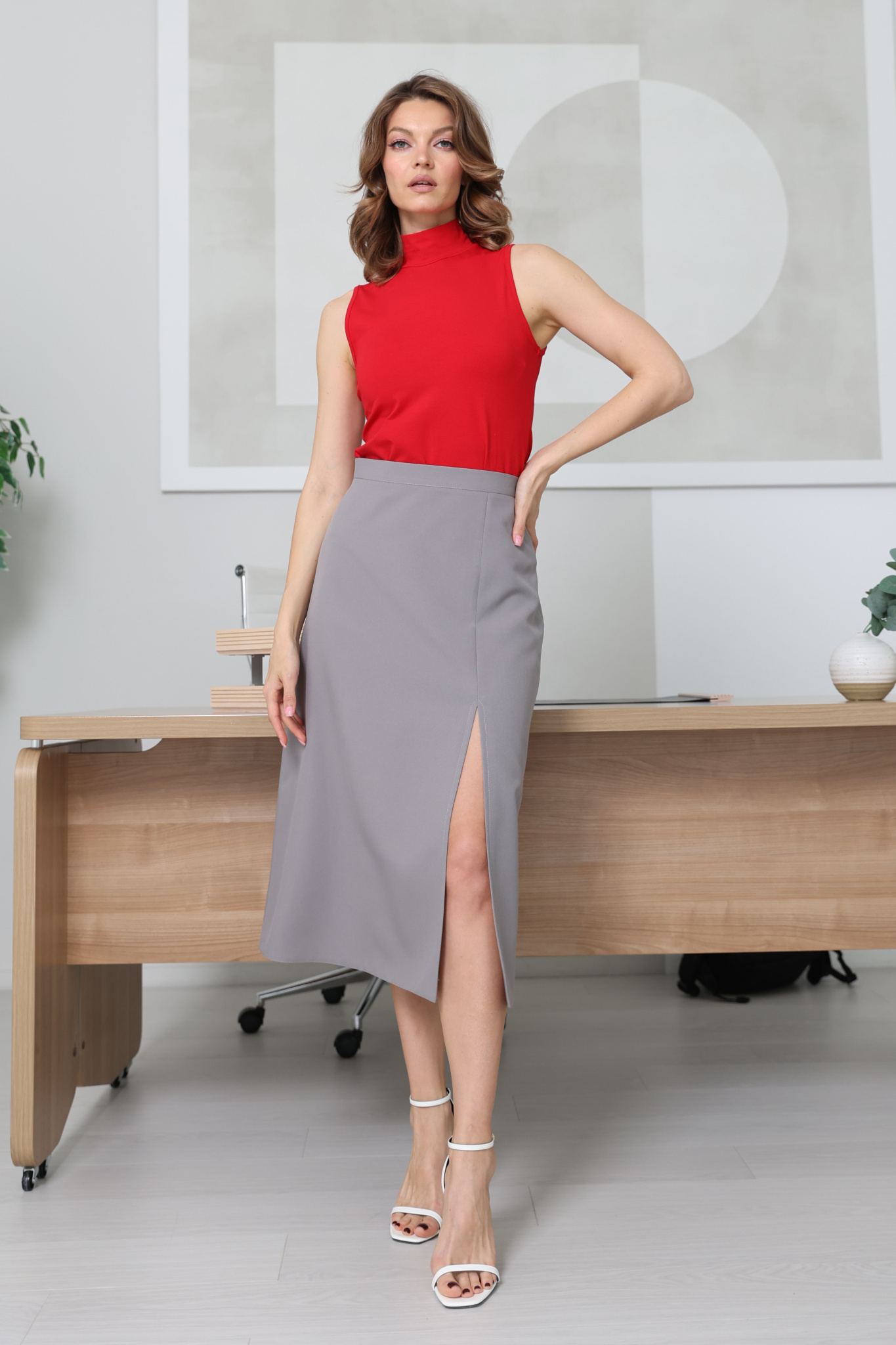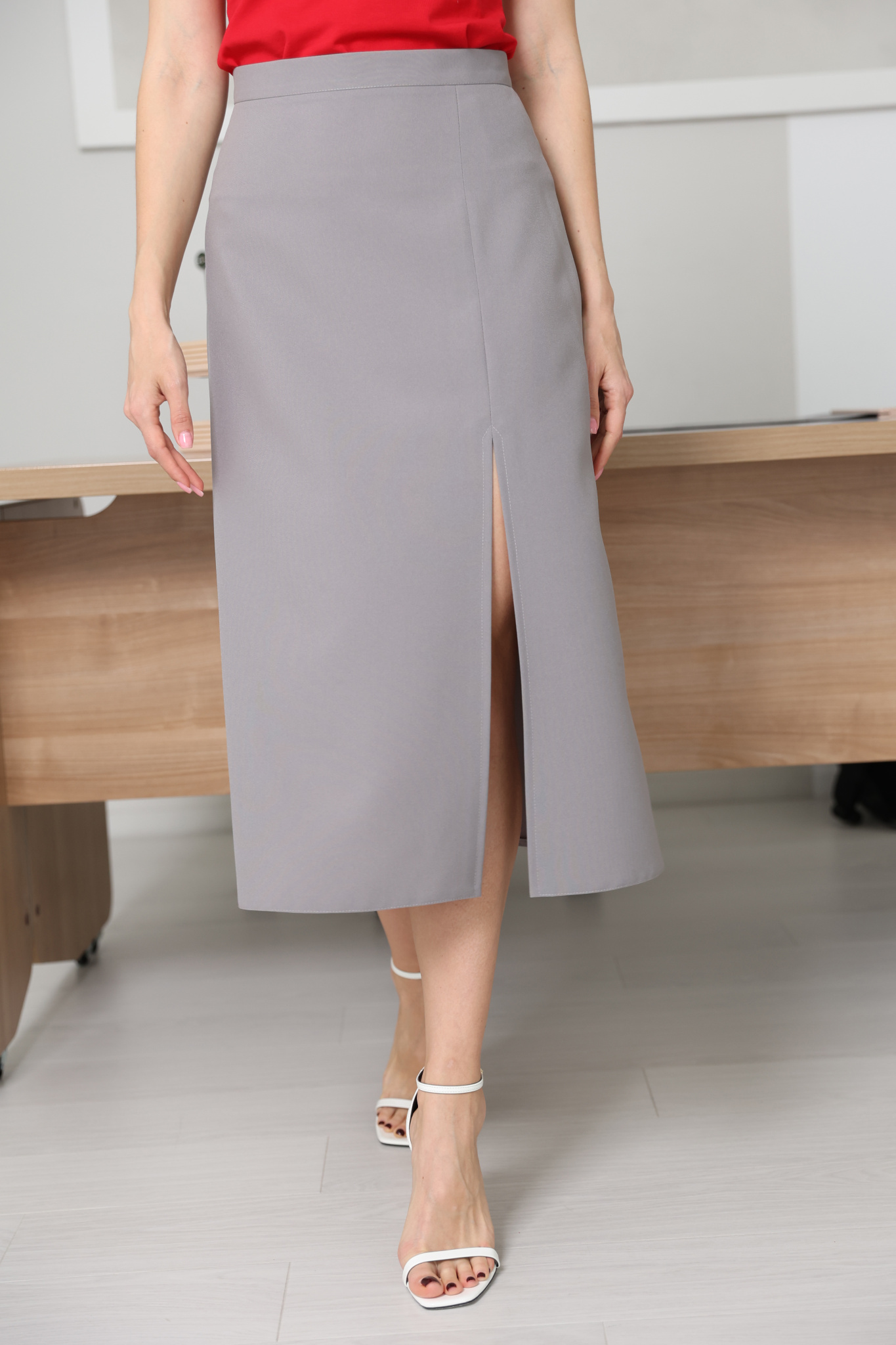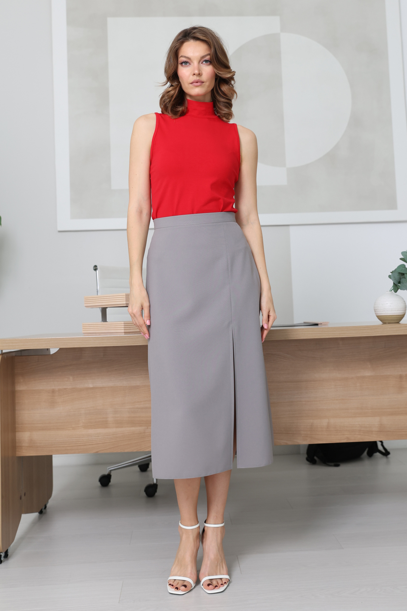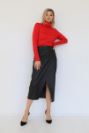 Юбка трапеция с притачным поясом. Потайная молния в среднем шве спинки. Смещённый разрез по переду. Изделие выполнено без подкладки.