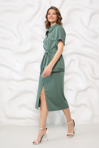 Юбка трапеция с притачным поясом. Потайная молния в среднем шве спинки. Смещённый разрез по переду. Изделие выполнено без подкладки.