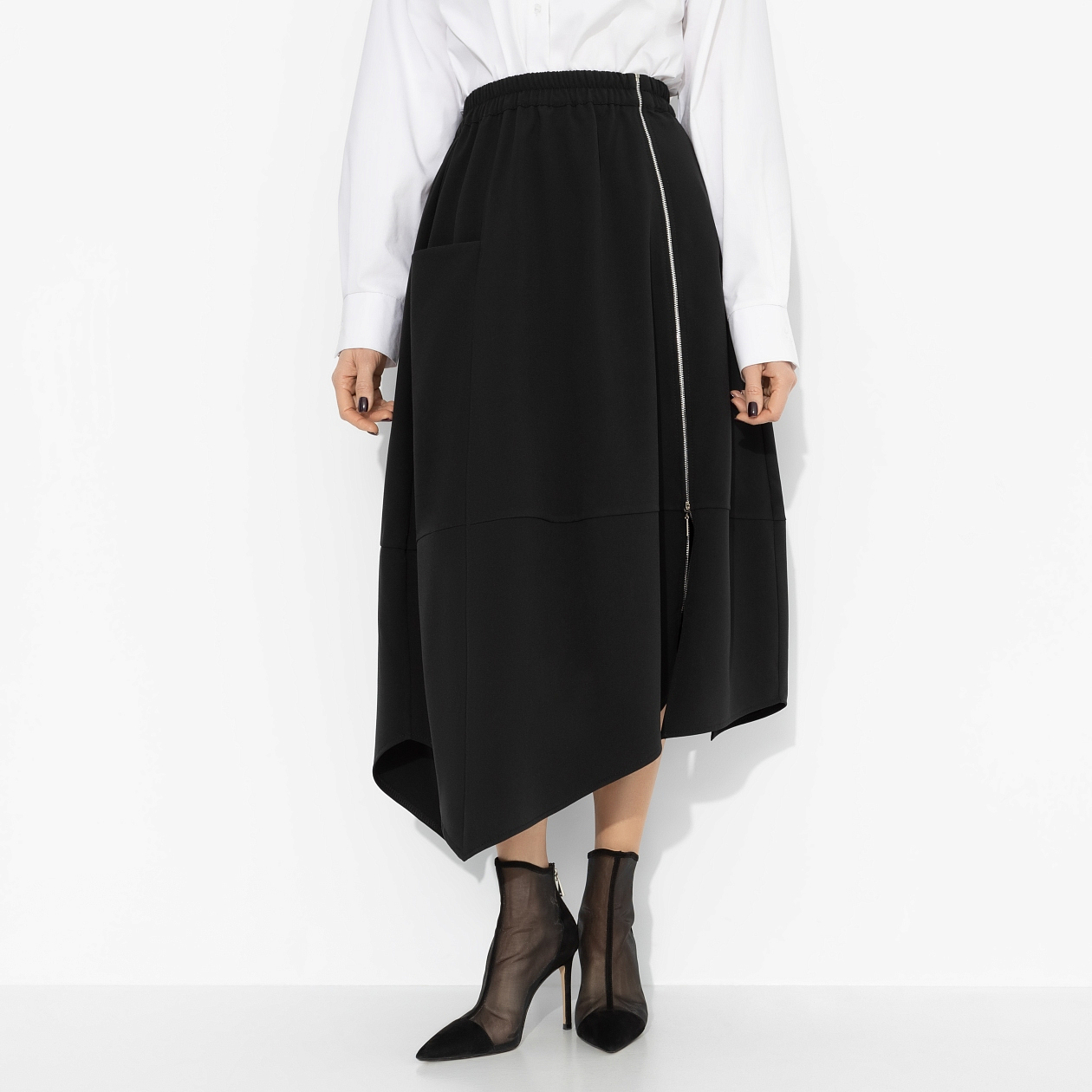 Стать fashion-сенсацией легко! Зендая в своей асимметричной макси-юбке на фото-колле в Париже показала, как неровный подол меняет силуэт. А еще это тренд из коллекций Alaïa Resort 2026. С одной стороны миди, с другой длиннее – в этом образе много драмы. Актуальная юбка с посадкой на талии и пышным силуэтом, красиво драпируется и сочетается с самыми разными вариантами верха. Пояс на резинке. Изделие оформлено асимметричной молнией, которая визуально вытягивает силуэт, и накладным карманом.