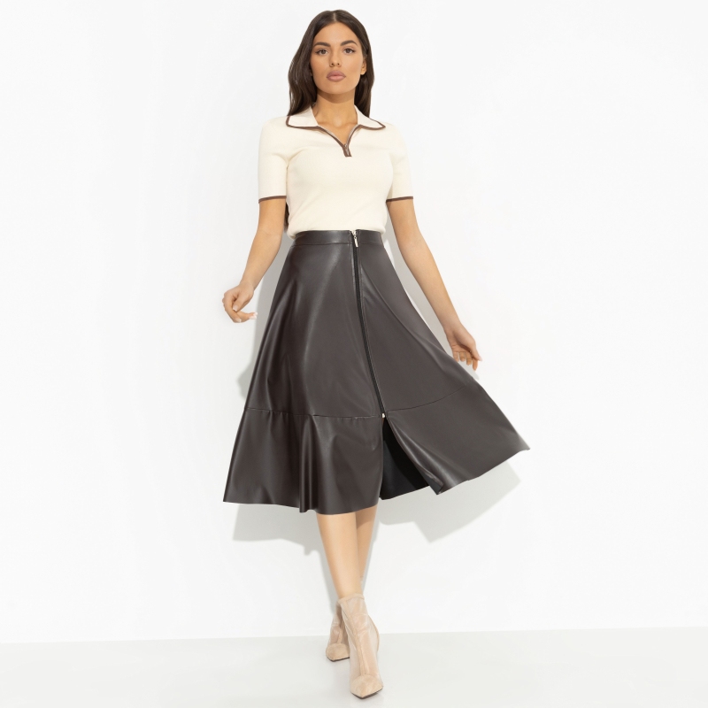 Тренд, который стал классикой. Экокожа настолько прочно вошла в модную историю, что ни один дроп знаменитых брендов не обходится без этого материала. Экокожа в элегантном воплощении не перестанет быть актуальной уже никогда. Юбка расклешенная в длине миди. Посадка на талии. Застегивается на акцентную молнию по передней части изделия.