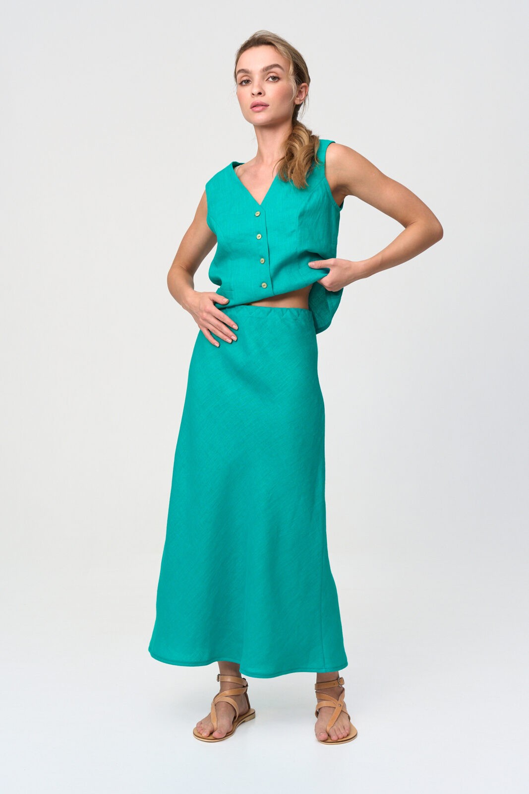 Юбка длинная коническая косого кроя. Пояс цельнокроеный с декоративной строчкой по резинке.