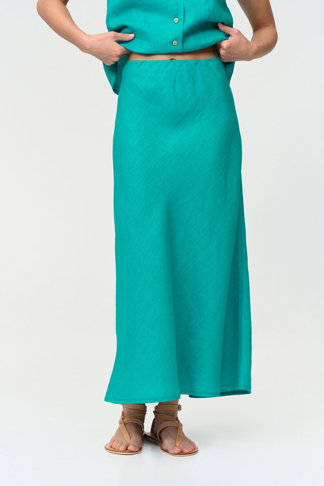 Юбка длинная коническая косого кроя. Пояс цельнокроеный с декоративной строчкой по резинке.