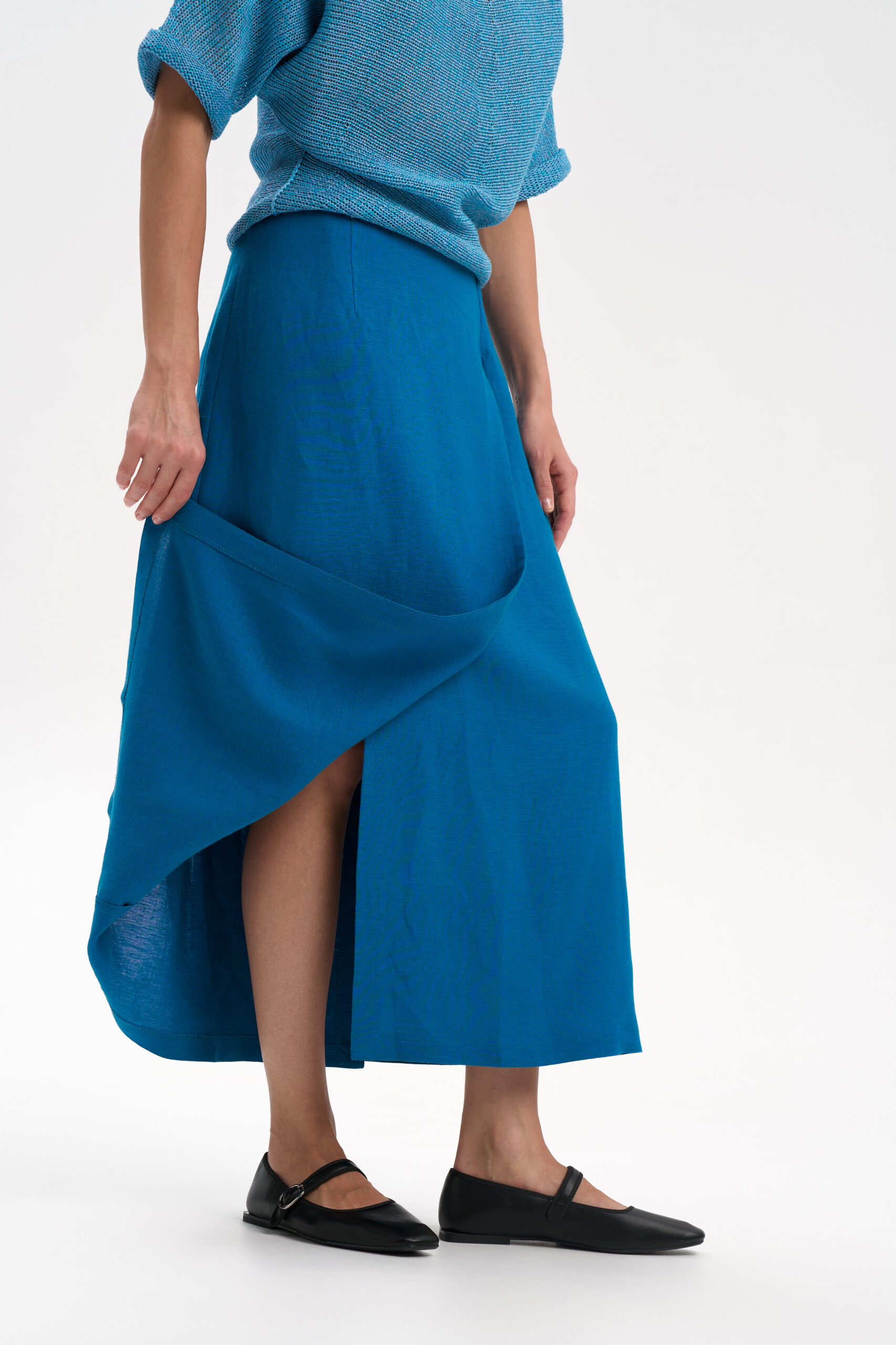 Юбка длинная прямая с имитацией запаха спереди и сзади. Пояс притачной с эластичной тесьмой по бокам. Застежка на потайную молнию сбоку.