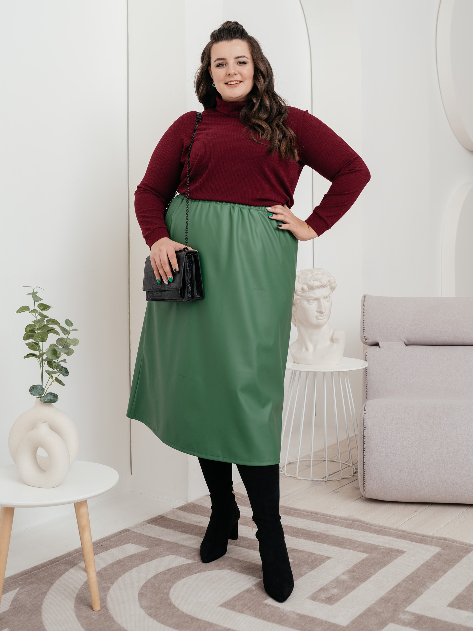 Состав: 95 % полиэстер, 5% эластан. Ткань: экокожа на трикотажной основе. Цвет: зеленый. Посадка: средняя. Силуэт: А-силуэт. Длина: ниже колена. Изделие без подклада.Параметры модели: ОГ117/ОТ99/ОБ139. Рост модели 178 см. Размер изделия на модели 60. В данном образе используется водолазка Б028-32.