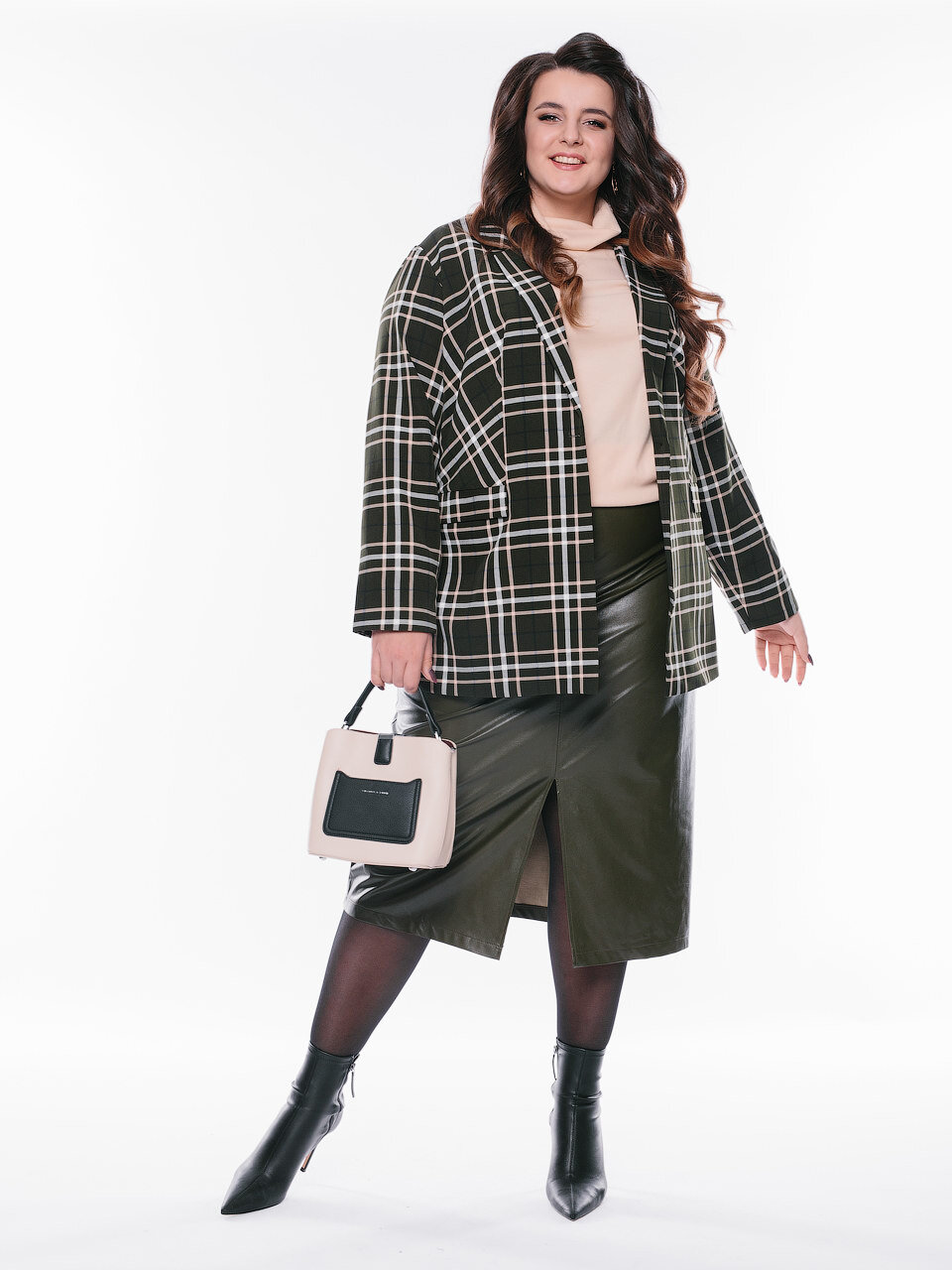 Состав: 95% полиэстер,5% эластан. Ткань: экокожа. Цвет: хаки. Посадка: средняя. Силуэт: прямой. Длина: ниже колена. Особенности модели: перед с разрезом в среднем шве. Спинка с декоративной молнией в среднем шве. Пояс притачной. Изделие без подклада. Параметры модели: ОГ112/ОТ93/ОБ130. Рост модели 178см. Размер модели 60. В даном образе используется жакет Б528-5 и водолазка Б578-2/ блуза Б014-29 и жилет Б581-3/ блуза Б014-29 и жилет Б581-6.