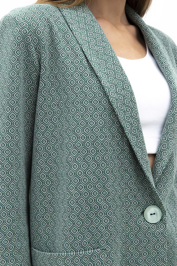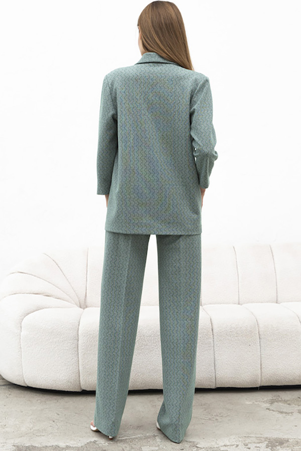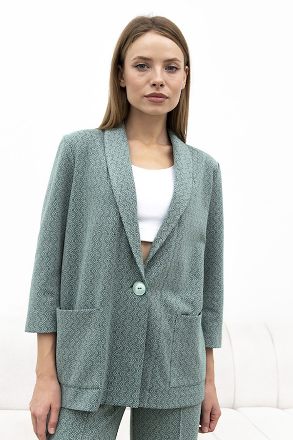 Костюм из жаккардового эластичного полотна. Брюки прямого силуэта. Пояс притачной с эластичной резиной. На передней части брюк застрочены стрелки. Жакет прямого свободного кроя с женственным шалевым воротником. На передней части изделия застежка на пуговицу и накладные карманы. Втачной рукав 3/4. Изделие с плечевыми накладками, которые при желании можно убрать.