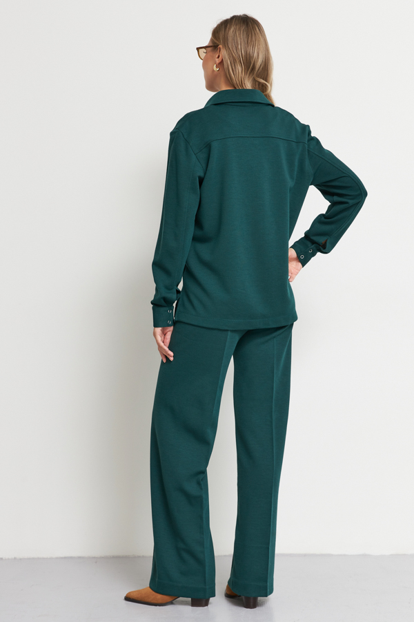 Жакет выполнен из эластичного полотна. Изделие в рубашечном стиле. Свободный силуэт с разрезами в боковых швах и застёжкой на планке. Вырез горловины обработан отложным воротником на стойке. Втачной рукав на манжете с застёжкой на кнопки.