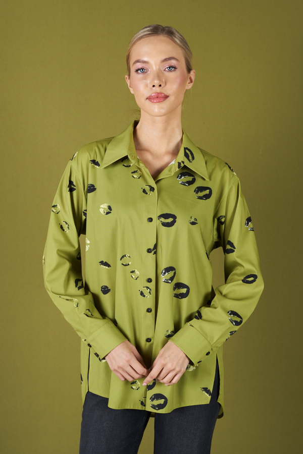 Рубашка свободного силуэта из вискозной ткани с застёжкой на пуговицы. Низ изделия асимметричной длины (спинка удлинена относительно переда) с закруглениями по бокам и разрезами. Рубашечный рукав на манжете с застёжкой на пуговицы. Вырез горловины обработан отложным воротником на стойке. На задней части изделия выполнена кокетка с небольшой складкой. Достоинство этой модели в способности скрыть некоторые недостатки фигуры. Её можно сочетать как с брюками, так и с джинсами.