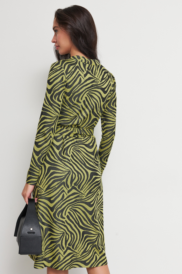 Платье прямого силуэта из эластичного полотна с жаккардовым анималистичным узором. Глубокий V-образный вырез горловины плавно переходит в запах, фиксируется притачным поясом. Втачной длинный рукав.