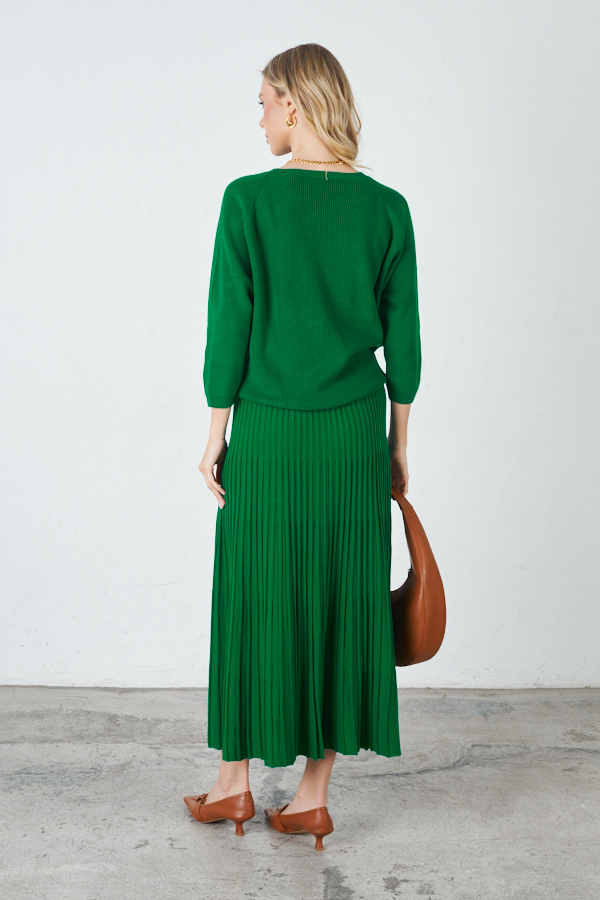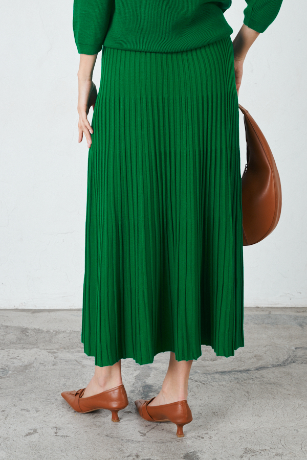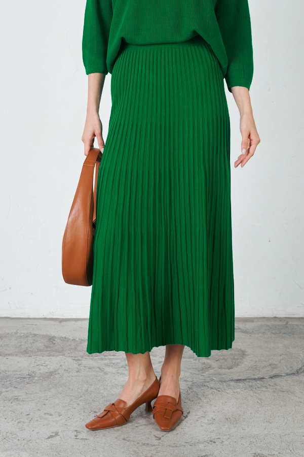 Юбка плиссе, расширенная книзу с поясом. Изделие выполнено из мягкой структуриванной пряжи.