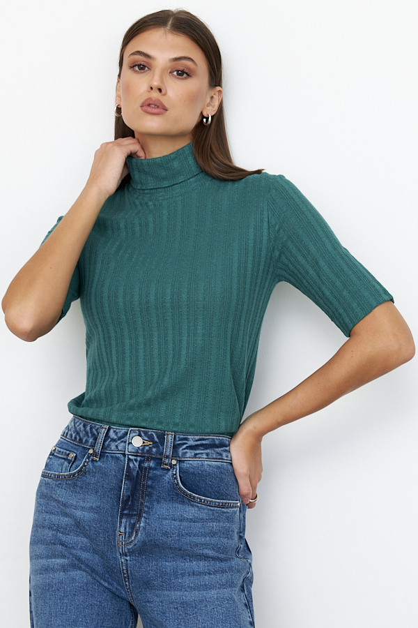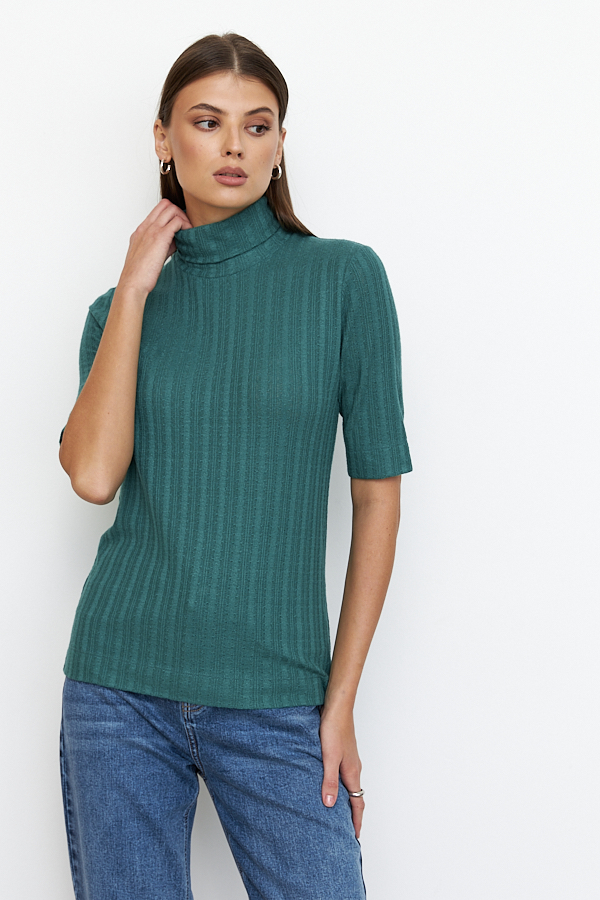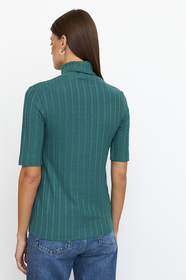Джемпер прилегающего силуэта из фактурного эластичного полотна. Втачной короткий рукав. Вырез горловины высокая стойка. Джемпер – это хорошая базовая вещь, подходящая для любого гардероба.