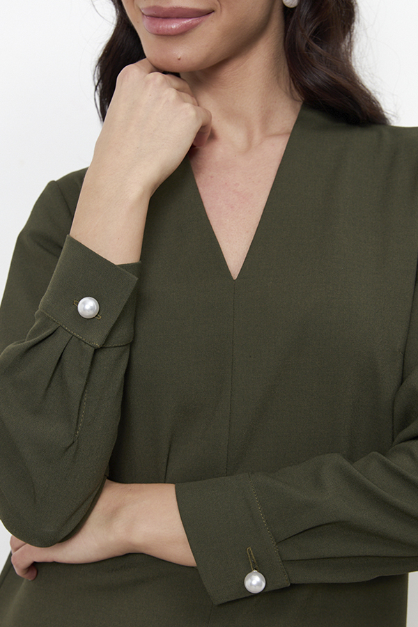 Платье свободного силуэта из плательной ткани. По центру передней части изделия выполнен шов. Цельнокроеная стойка, переходящая в V-образный вырез горловины, визуально делает фигуру стройнее. Втачной длинный рукав. Низ рукава на манжете с застёжкой на пуговицы-жемчужины.