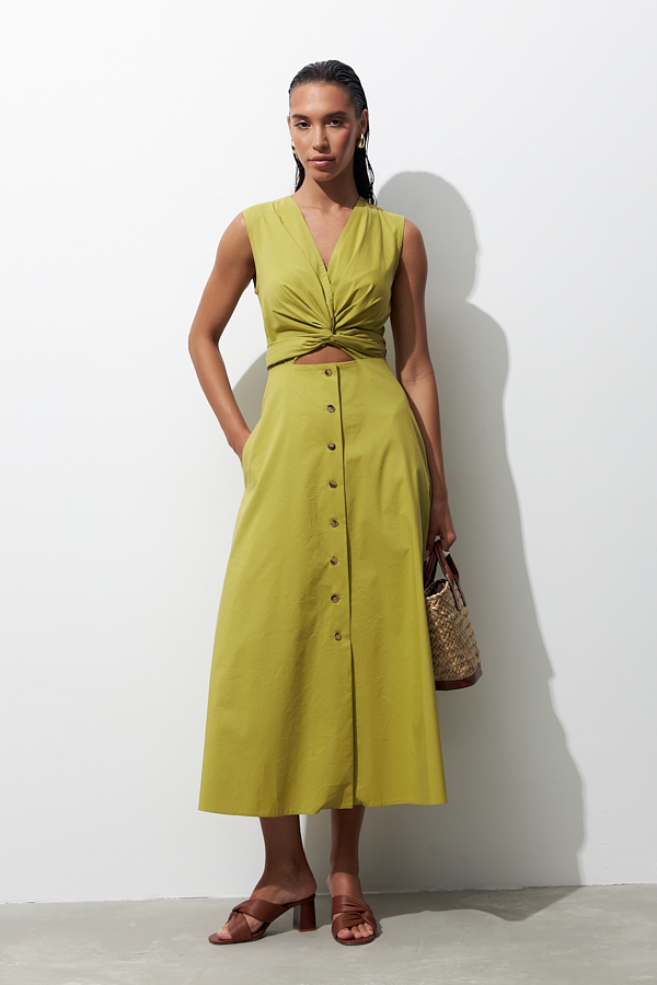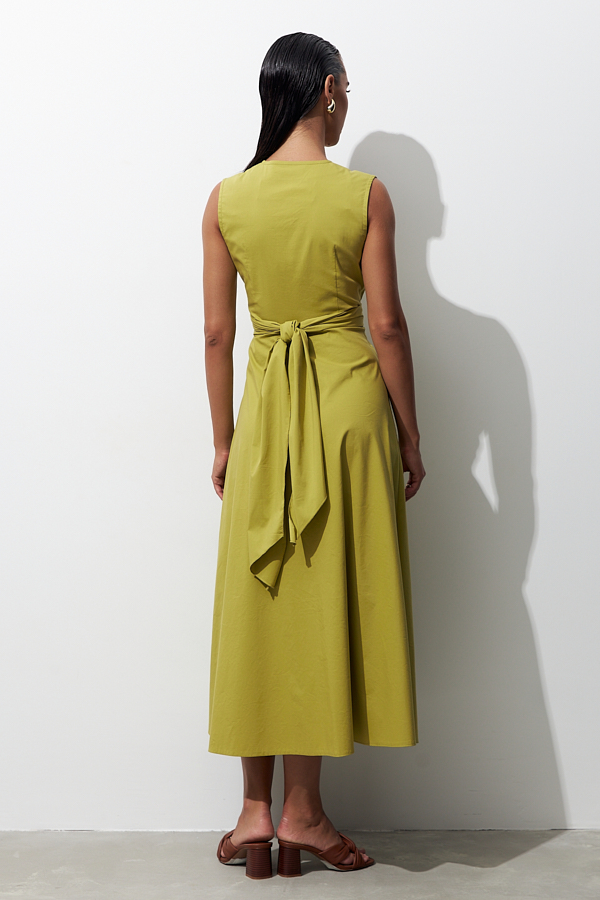 Платье из хлопковой ткани отрезное по линии талии. Изделие прилегающего силуэта в области груди и свободного кроя в области бёдер, с карманами в боковых швах. Линия талии завышена. На полочке нагрудная вытачка переведена в широкий цельнокроеный пояс, завязывающийся сзади. На спинке — талиевые вытачки. Глубокий V-образный вырез горловины. Застёжка на пуговицы в нижней части платья.
