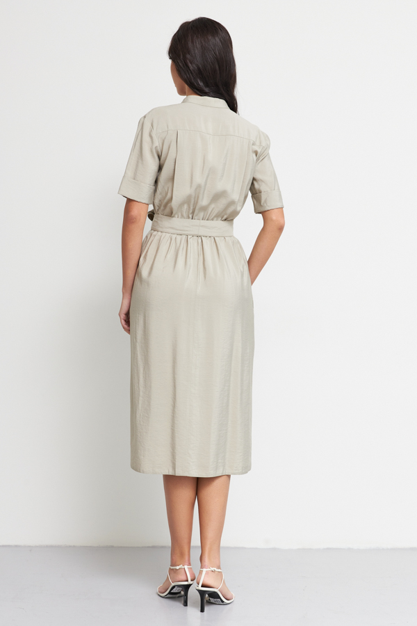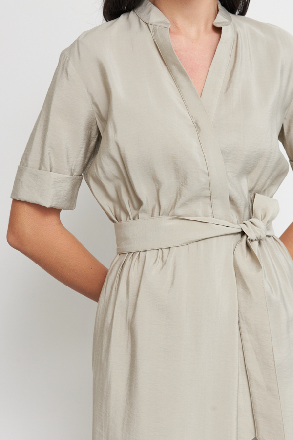 Платье из вискозной ткани с крэш-эффектом свободного силуэта. Изделие отрезное по линии талии с резинкой. Лиф платья с запахом, фиксируется на пуговицу для удобства. На передней части юбки выполнена складка, имитирующая запах, в боковых швах карманы. Линия горловины оформлена воротником-стойкой. Втачной короткий рукав с отворотом. В комплекте пояс из основной ткани.