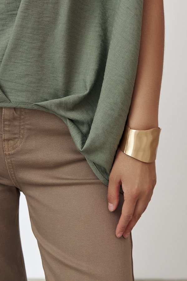 Блуза из вискозной ткани с крэш-эффектом. Свободный крой асимметричной длины (спинка удлинена относительно переда). Спущенное плечо. Линия проймы, линия горловина и низ изделия окантованы косой бейкой из основной ткани. Изюминкой являются оригинальные складки на передней и задней части изделия.