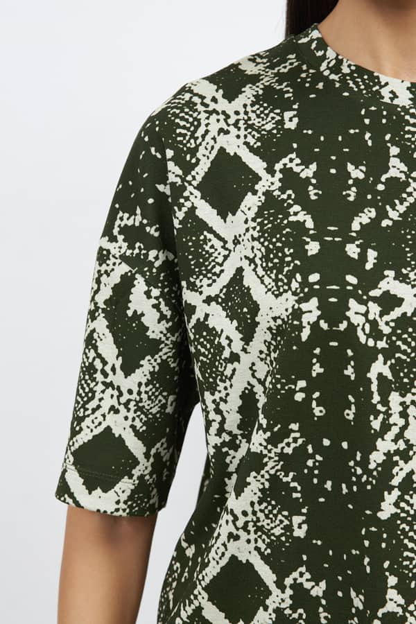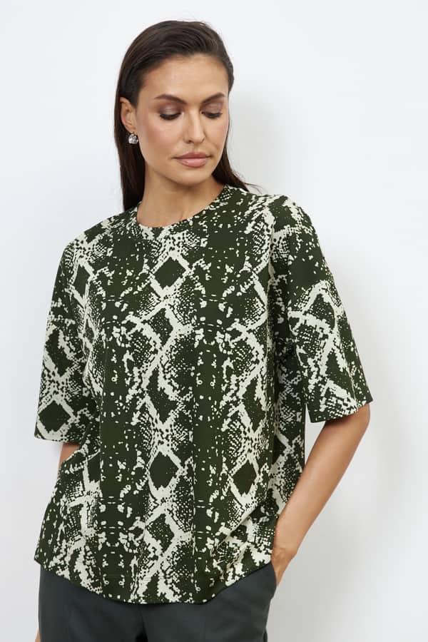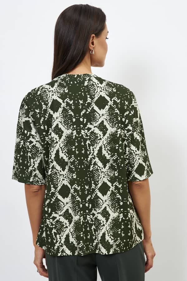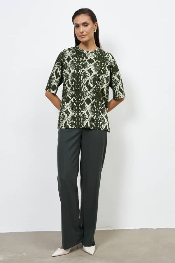 Джемпер из эластичного полотна. Свободный силуэт со спущенной линией плеча и рукавом до локтя. Вырез горловины оформлен бейкой из основной ткани. В таблице размеров представлены параметры человека, а не изделия.