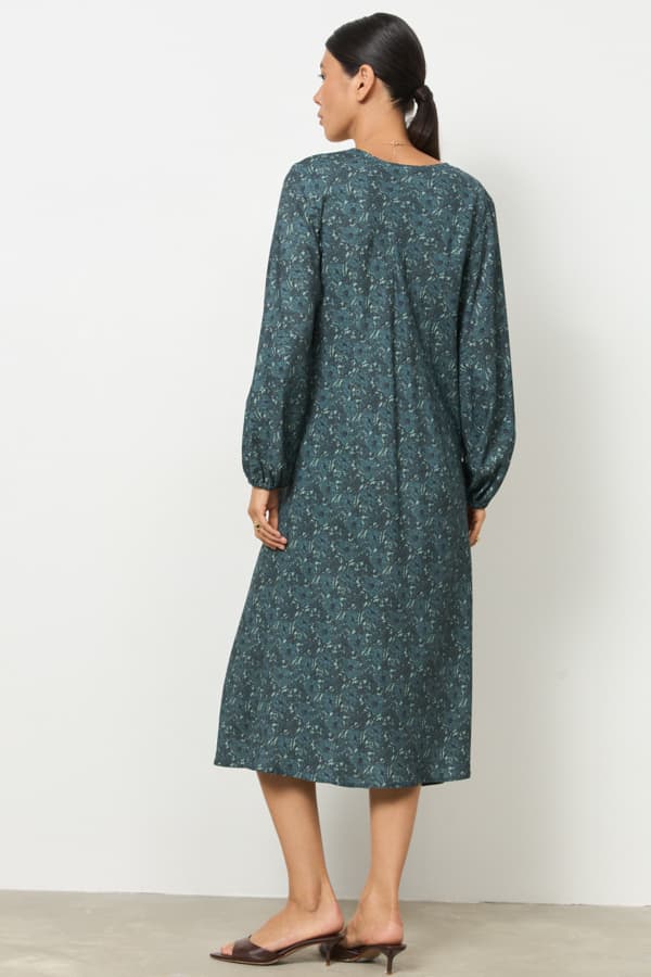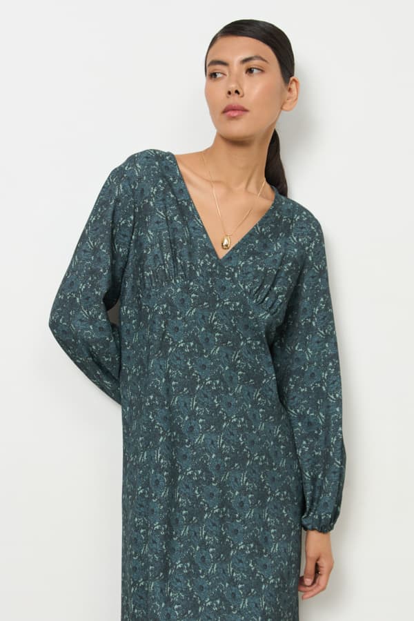 Платье из вискозной ткани свободного силуэта. На передней части изделия выполнен фигурный подрез в области груди, со сборкой. V-образный вырез горловины. Сзади изделие отрезное по линии талии, линия талия завышена. Верхняя часть юбки со сборкой. Втачной длинный рукав, по низу рукава сборка на резину. В таблице размеров представлены параметры человека, а не изделия.