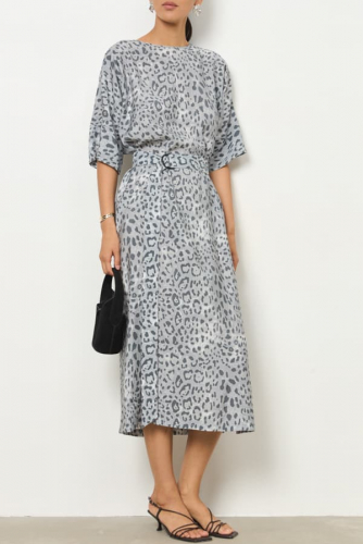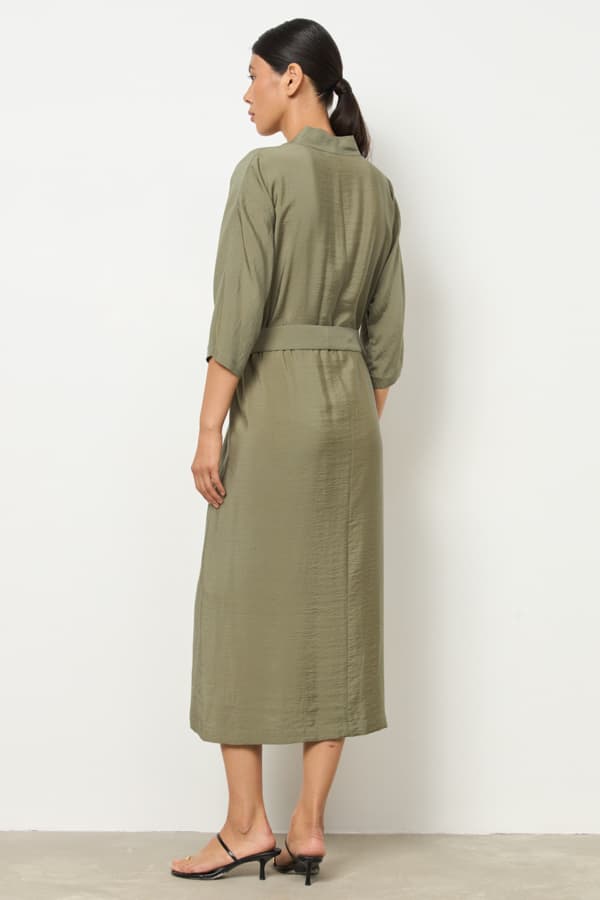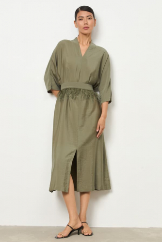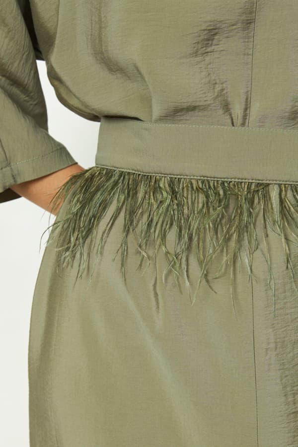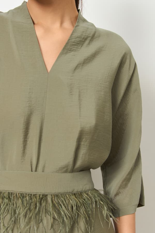 Платье из вискозной ткани с крэш-эффектом свободного силуэта. По центру передней части изделия выполнен шов, снизу — разрез. Цельнокроеная стойка, переходящая в V-образный вырез горловины, визуально делает фигуру стройнее. Длинный цельнокроеный рукав. В комплекте два пояса из основной ткани: один классический, другой — с декором из перьев.